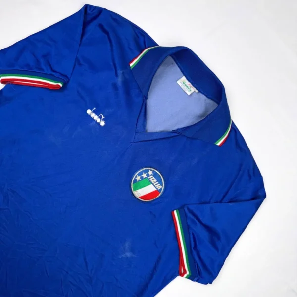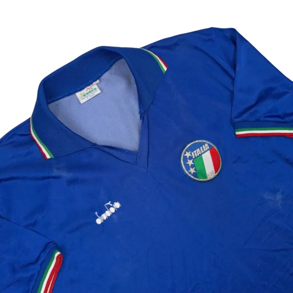 Note IFS : 8/10 – Très bon état pour ce maillot rarissime de l’Italie datant de 1986 et utilisé jusqu’en 1990. Quelques traces sur l’avant, écusson et logo Diadora brodés. Il existe plusieurs versions de ce maillot produites sur ces quatre années, avec ou sans logo Diadora et des cols différents selon les saisons, ce qui en fait une vraie pièce collector pour les tifosi. Ce maillot rétro est plus vieux que nous, et aussi bien conservé !