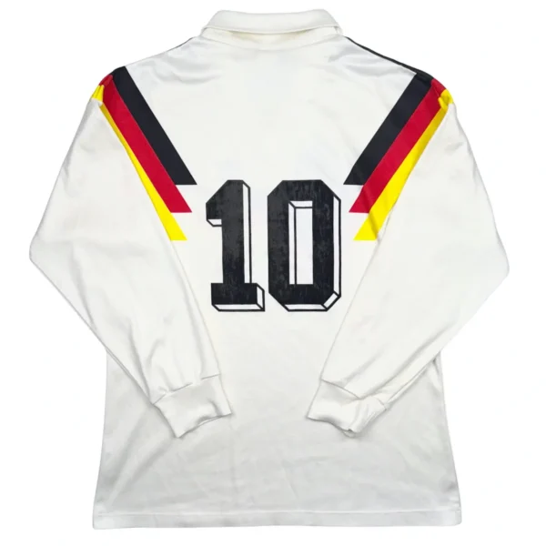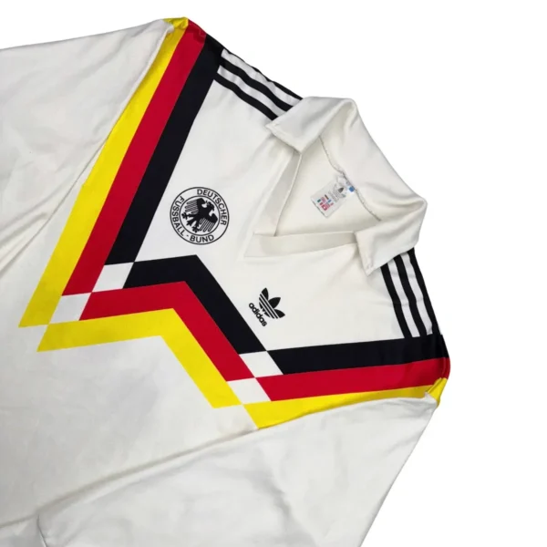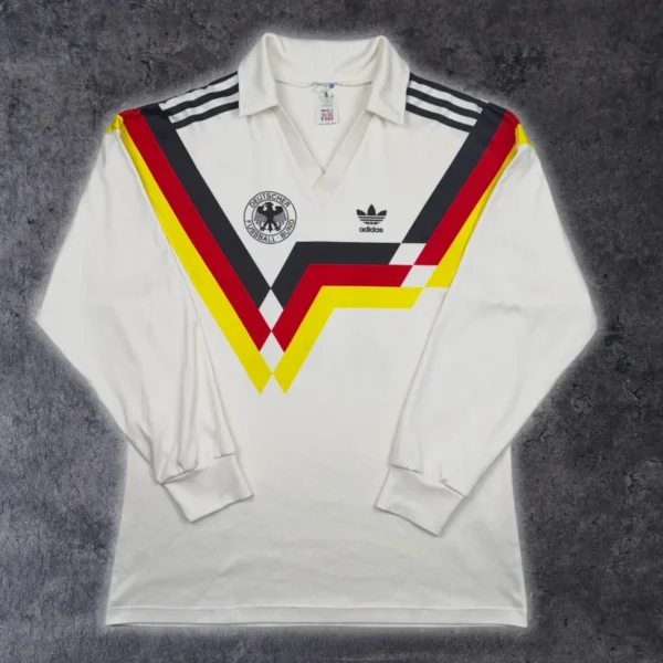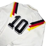 Note IFS : 9/10 – Maillot vintage de l’Allemagne extrêmement rare, version « Prototype » jamais commercialisée. Particularité unique : inversion des éléments sur la face avant, avec le logo adidas et l’écusson sublimés à l’emplacement opposé à celui habituel. En plus, il arbore un col et des manches longues, ce qui en fait une pièce exceptionnelle.