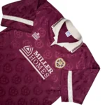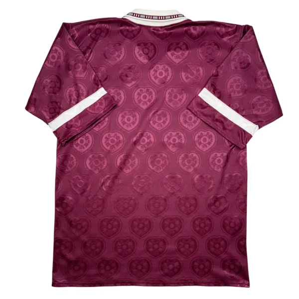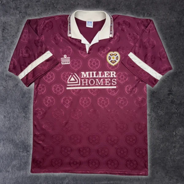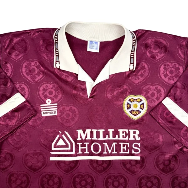 Note IFS : 9/10 – Maillot des Hearts, équipe de première division écossaise. Hyper rare et en excellent état pour son âge. Écusson en feutrine un peu marqué, mais le reste est nickel. Logo Admiral et sponsor aussi en feutrine, taille grand. Première collab avec Admiral après Bukta. Design complètement fou avec le blason du club dessiné dans le tissu. Une vraie pièce de malade, exactement pour ça qu’on a créé IFS.