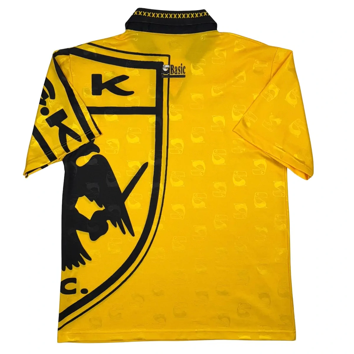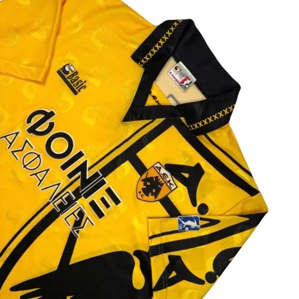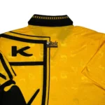 Note IFS : 9/10 – Maillot domicile de l’AEK Athènes 1993/95, extrêmement rare. Quelques fils tirés mais rien de grave, écusson, logo Basic et sponsor en feutrine. Détail collector avec le patch “FSM”, marque de la société grecque Football Sports Marketing qui gérait alors la distribution des maillots du club. Une pièce introuvable, que certains proposent à plus de 375€.