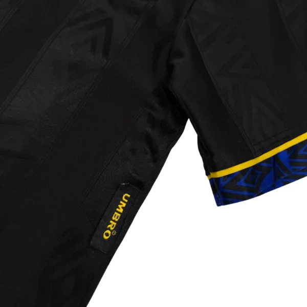 Note IFS : 9/10 – Usure normale pour un maillot de 30 ans : quelques bouloches et un léger frottement sur le logo en bas, mais le flocage est parfait. Le travail sur cette pièce est fou : col old school, flocage Umbro en feutrine, le flow du King… Un maillot ultra rare, chargé d’histoire.
