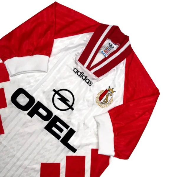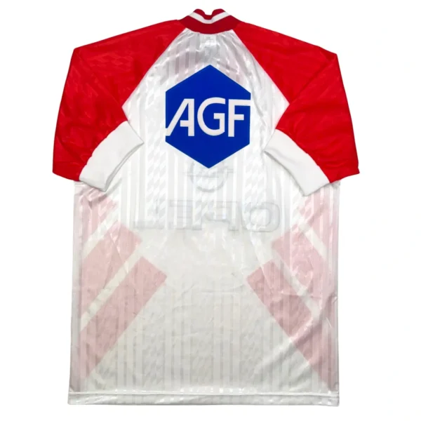 Note IFS : 10/10 – Parfait état pour cette pépite ! L’écusson du club et le AGF dans le dos sont en feutrine tout comme le sponsor Opel. A l’ancienne ! On est clairement ici sur une pièce d’exception ultra rare et en super état. Le design par Adidas est juste ouf, les bandes sur les hanches, le col, les manches… tout est incroyable, et en plus, made in Belgium, Iconic.