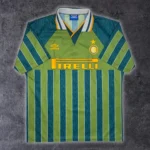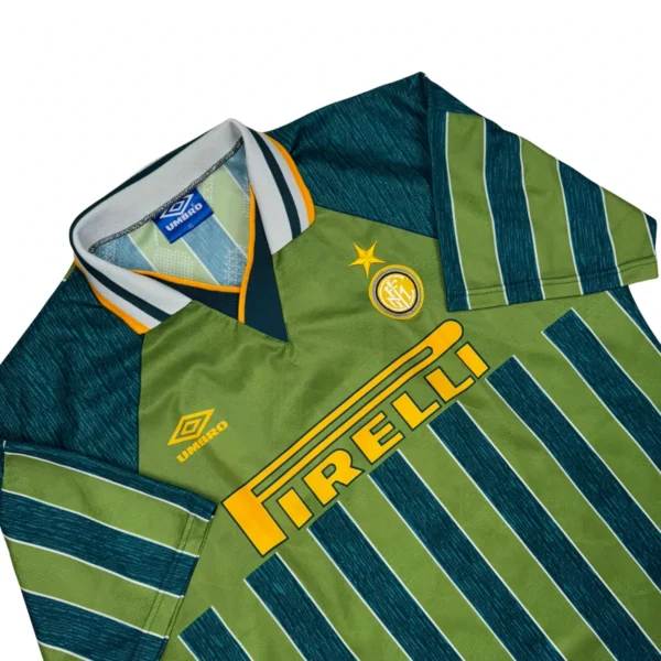 Note IFS : 10/10 – Plus de 30 ans au compteur et ce rarissime maillot est comme neuf… Le sponsor Pirelli et le logo Umbro sont imprimés dans le tissu, l’écusson brodé est parfait. Un maillot rétro de l’Inter ultra rare !