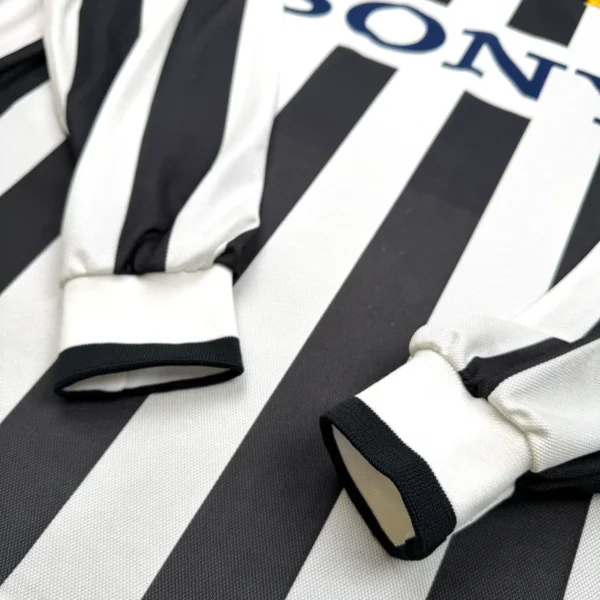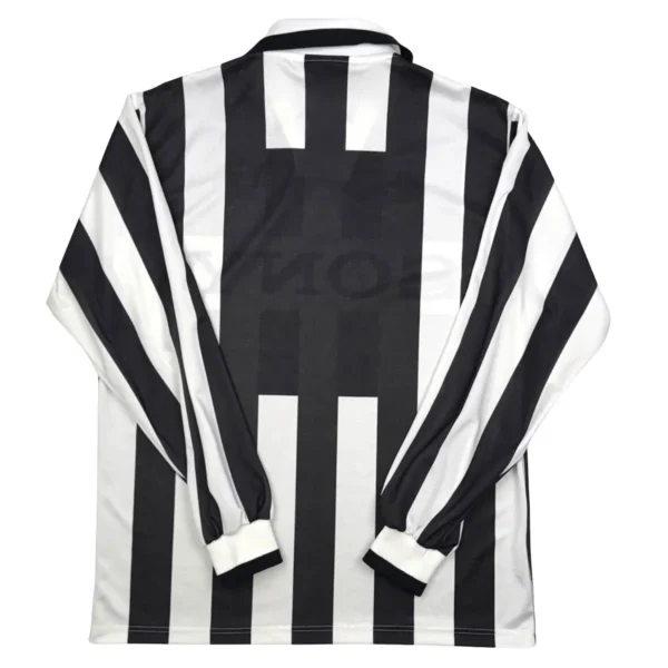 Note IFS : 9/10 – Maillot de la Juventus 1995 en excellente condition. Quelques discrètes bouloches mais rien de méchant pour son âge. Très rare en version manches longues, avec le sponsor Iconic Sony incrusté dans le textile, logo Kappa et étoiles brodées. Aucun risque au lavage, une pièce qui vieillira parfaitement. Avec un jeans et une paire d’Air Force blanches… Laisse tomber !
