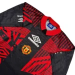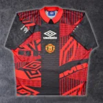 Note IFS : 9/10 – Maillot d’entraînement de Manchester United de 1995, une vraie dinguerie quand on y pense. Écusson en feutrine, logos Umbro incrustés dans le tissu et sponsor Sharp floqué sur les manches. Une pièce ultra rare 100 % vintage et violente si tu la portes bien. Ah le grand United des années 90…