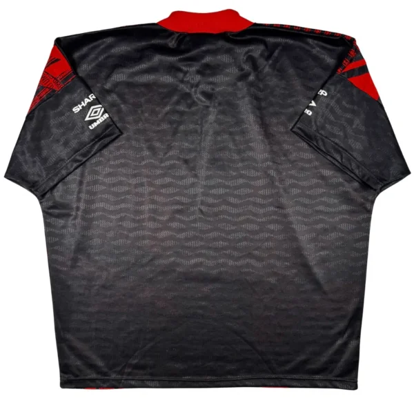 Note IFS : 9/10 – Maillot d’entraînement de Manchester United de 1995, une vraie dinguerie quand on y pense. Écusson en feutrine, logos Umbro incrustés dans le tissu et sponsor Sharp floqué sur les manches. Une pièce ultra rare 100 % vintage et violente si tu la portes bien. Ah le grand United des années 90…