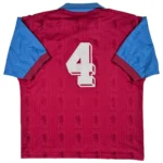 Notes IFS : 8/10 – Maillot rare d’Aston Villa, avec quelques taches discrètes et de légères bouloches. Flocage du numéro 4 légèrement usé, mais l’ensemble reste superbe. Très rare pour son âge, avec un gros travail de Reebok sur les détails, leur première collaboration avec le club après Asics.