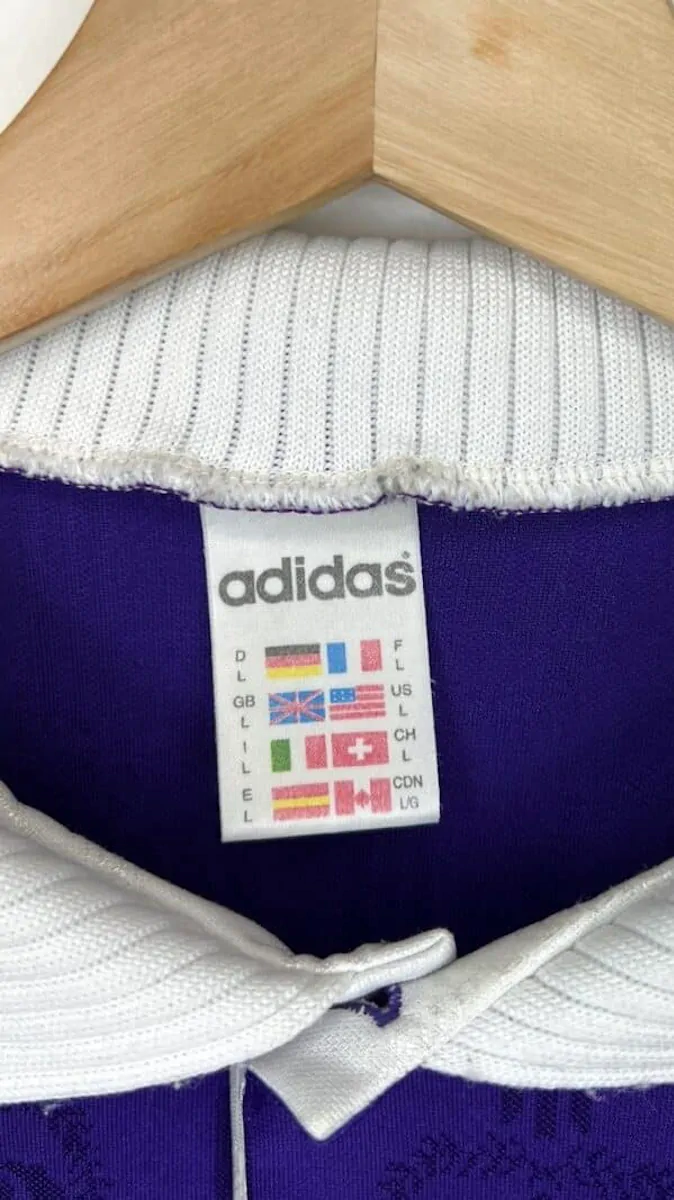 Note IFS : 9/10 – Rare maillot vintage en excellent état général, le sponsor en feutrine est un peu marqué par le temps mais rien de méchant. Le bas du maillot a été repris en couture à quelques endroits (voir photos). Ça reste discret au porté. Présence du bouton au col en parfait état. Flocage officiel Adidas au dos. Le style des maillots Adidas dans les années 90 est complètement incroyable, plus particulièrement ce modèle de 1996 !