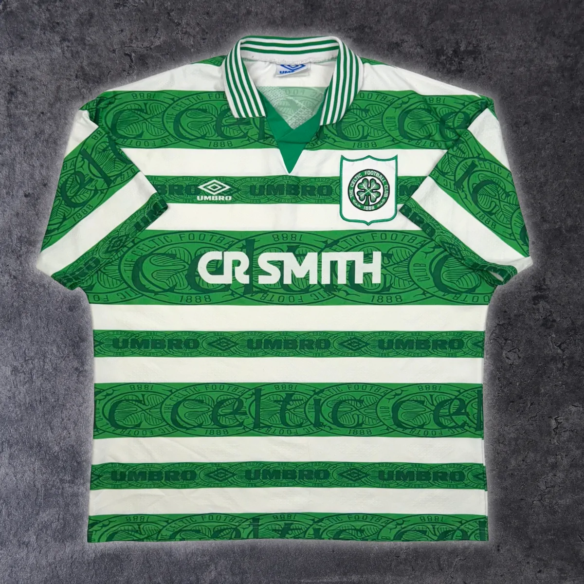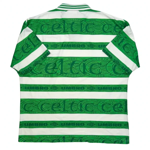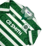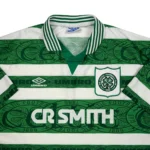 Note IFS : 7/10 – Rare maillot du Celtic datant de 1996, avec logo Umbro sublimé dans le tissu. Présente deux petits trous dans le dos et quelques fils tirés, masqués par le design bariolé. Une belle occasion de s’offrir un maillot Iconic à prix doux.