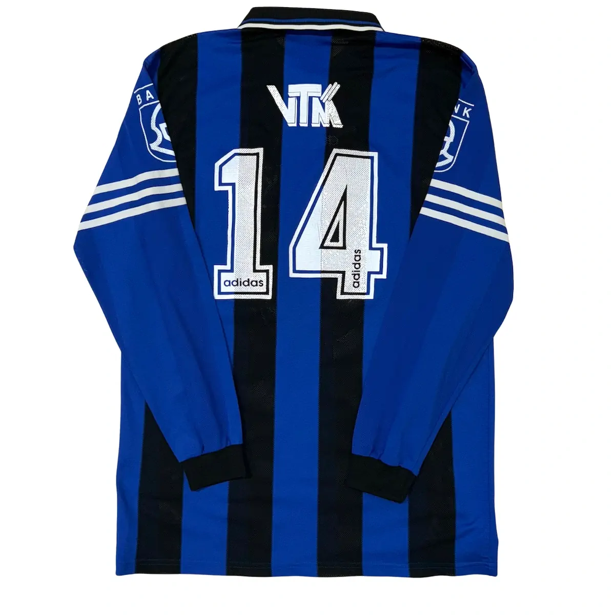 Note IFS : 10/10 – Parfaite condition ! Ce maillot vintage authentique provient du Club Brugge directement et n’a pas été commercialisé à l’époque. Sponsors floqués imprimés et pas en feutrine comme les version boutiques. Flocage officiel Adidas au dos. Superbe pièce rétro assez rare, et en plus, en manches longues… Iconic !