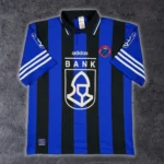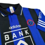 Note IFS : 9/10 – Excellente condition générale pour ce maillot rétro du Club de Bruges. Une petite tache sur le sponsor, sinon c’était le 10/10 assuré. Très rare dans un tel état, avec les sponsors en feutrine impeccables.