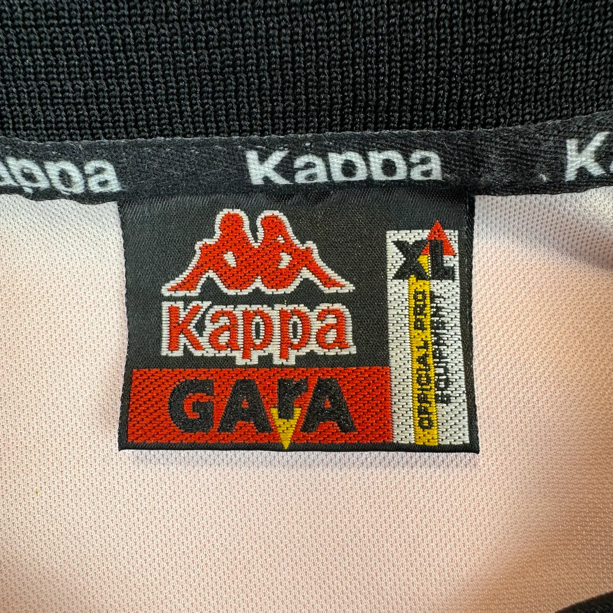 Note IFS : 9/10 – Excellente condition pour ce rarissime maillot vintage de la Juve. Il s’agit d’un collector, le fameux maillot centenaire de la Vieille Dame, le « Juvecentus ». Très très dur à trouver dans cette condition. Le sponsor est imprimé dans le maillot et le Kappa est brodé. Une pépite…