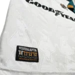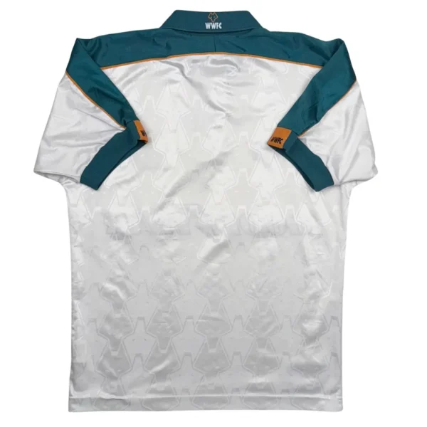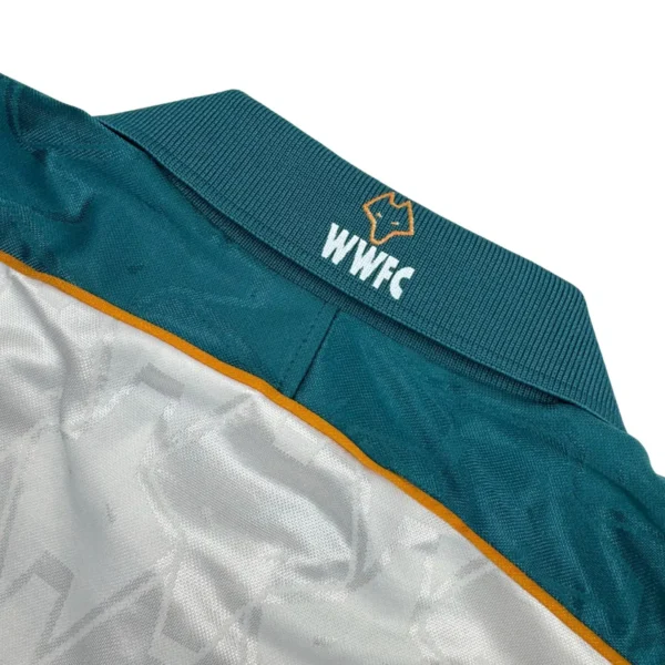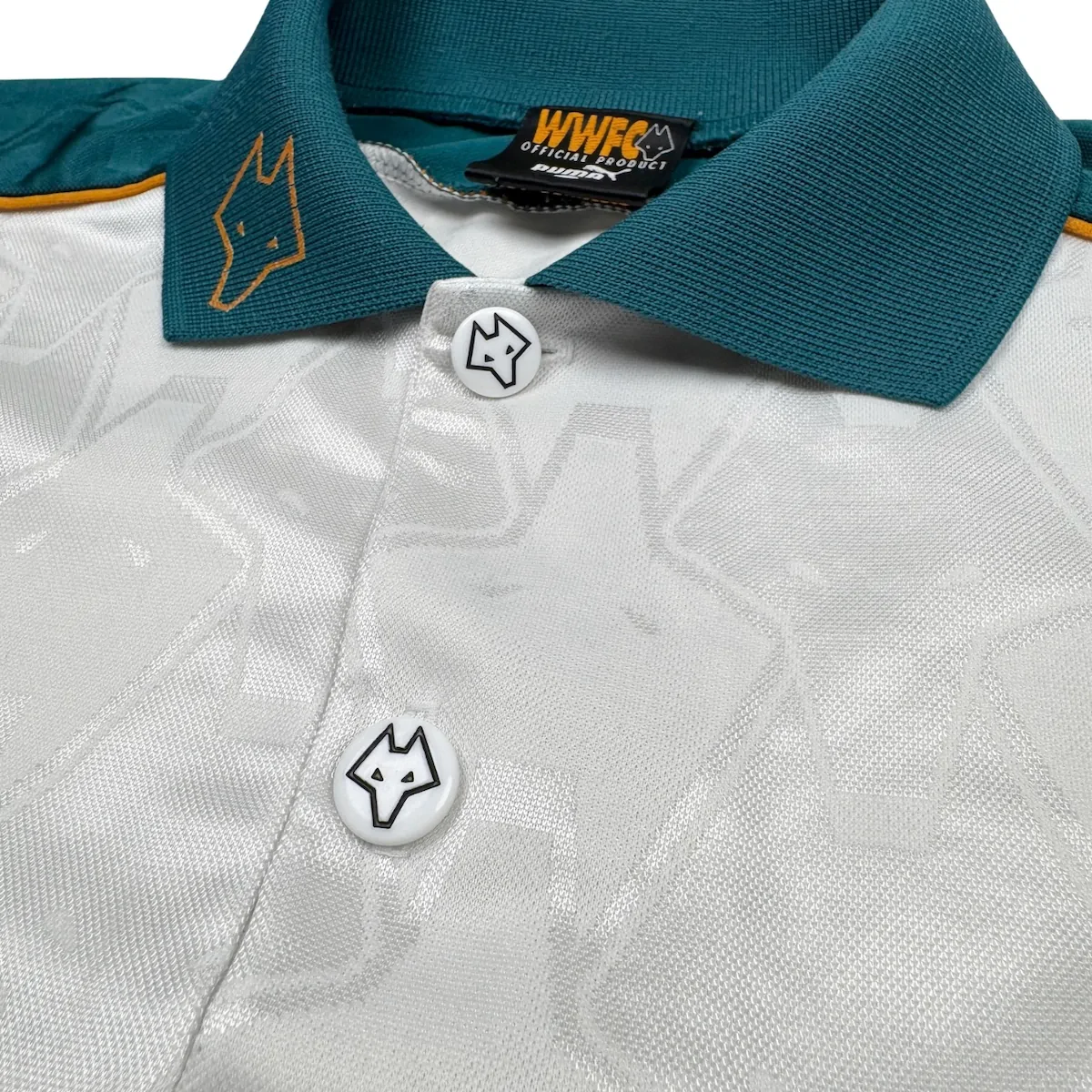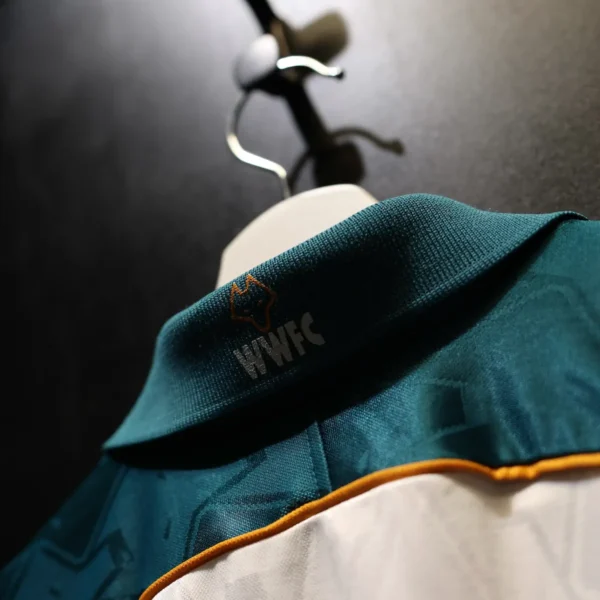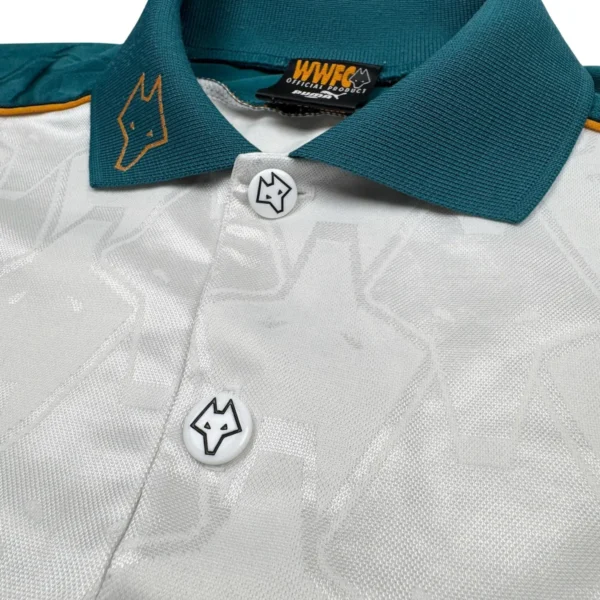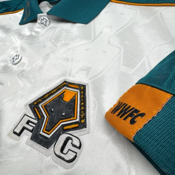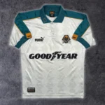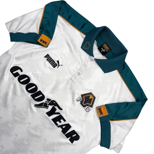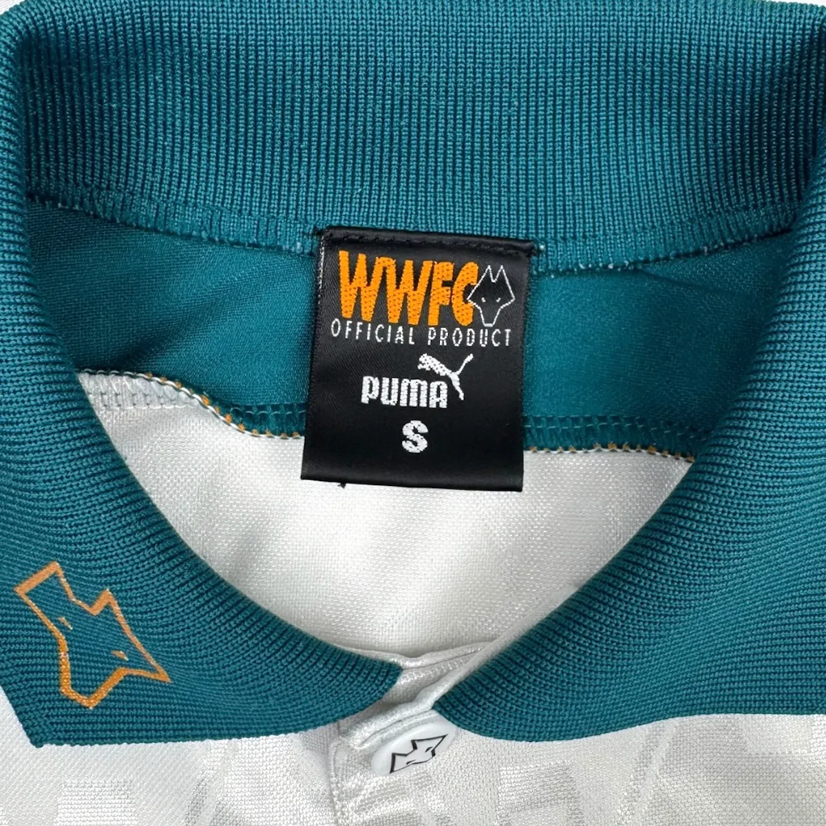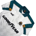 Note IFS : 8/10 – Très rare maillot des Wolves signé Puma, avec sponsor Goodyear et écusson en feutrine. Quelques bouloches et légère usure mais les boutons d’origine sont toujours là, avec les logos du club gravés dessus. Fabriqué en Angleterre, qualité top qui se ressent direct. Un design incroyable, une vraie œuvre d’art, une dinguerie.