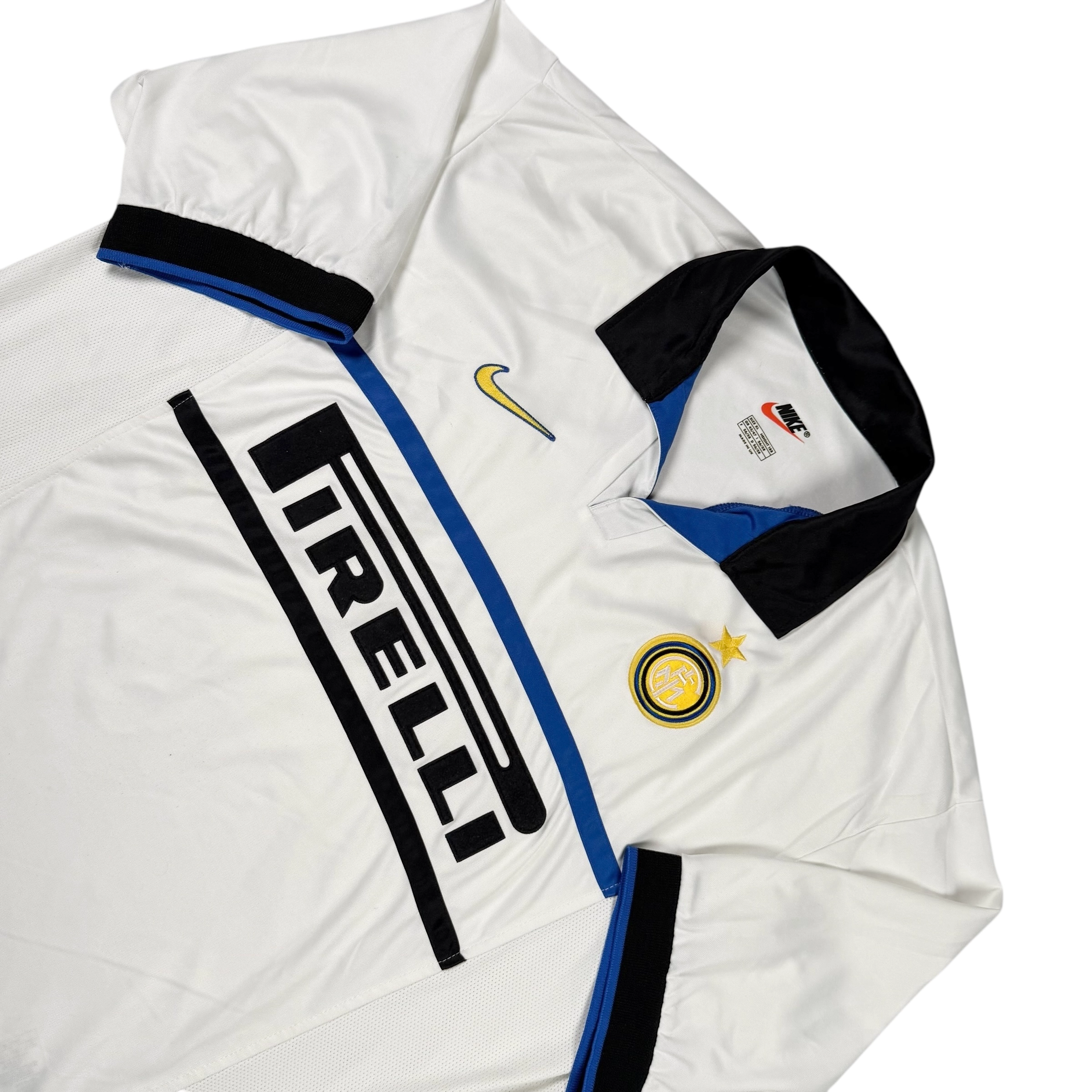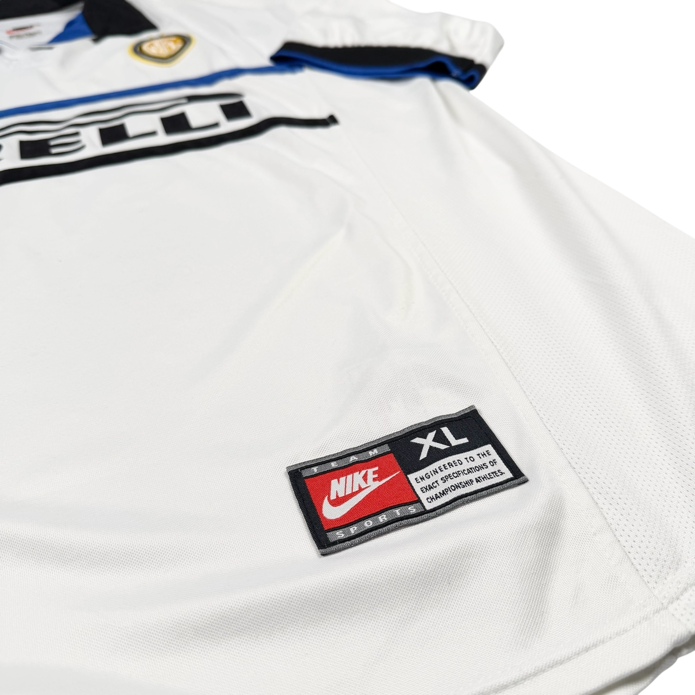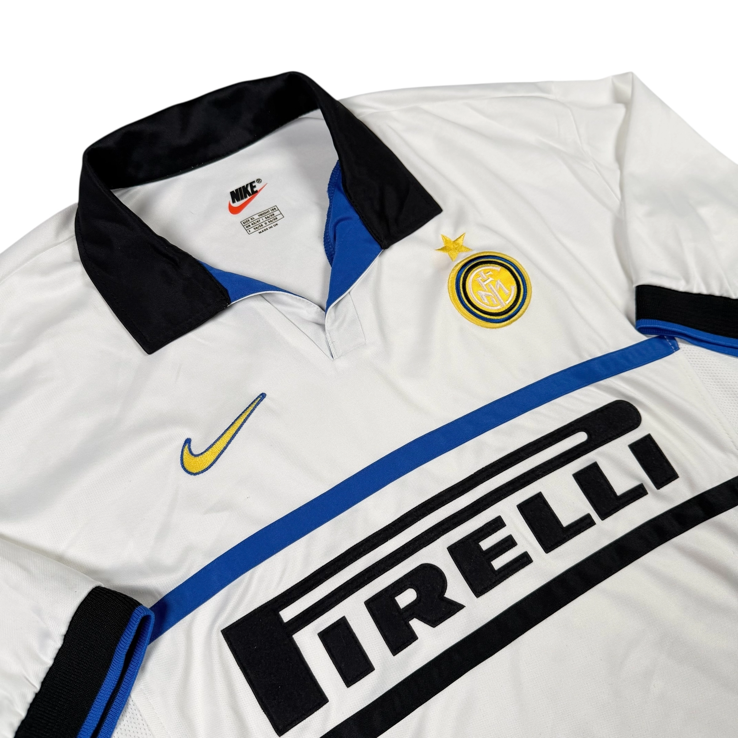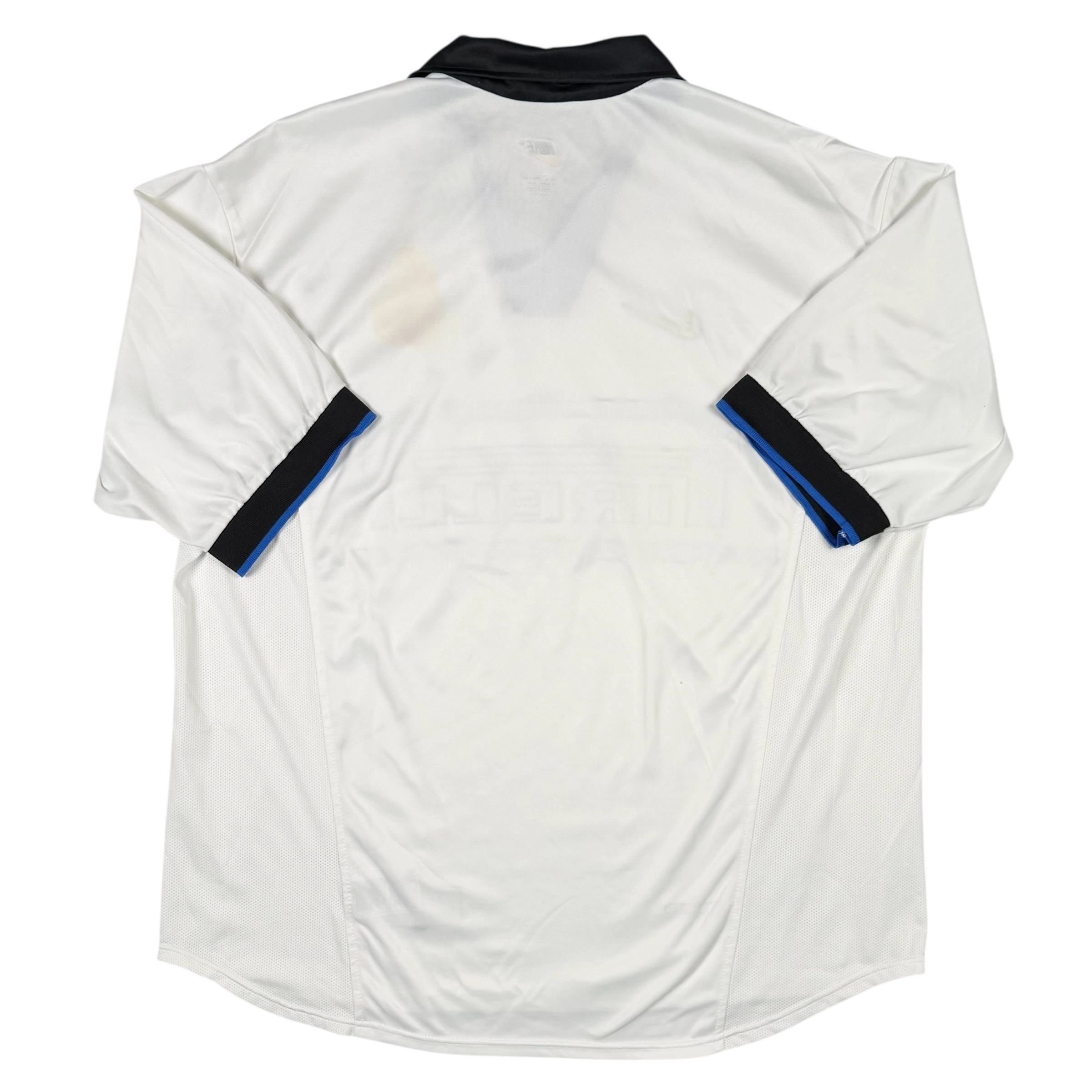 Note IFS : 9/10 – Rare maillot vintage de l’Inter Milan en superbe condition, issu de la première collaboration avec Nike en 1998, après l’ère Umbro. Sponsor Iconic Pirelli en feutrine, quasi comme neuf, swoosh Nike jaune et bleu brodé et écusson du club brodé à l’ancienne. Un pur régal visuel, vraie pépite de l’époque Ronaldo R9, ultra recherchée pour les collectionneurs.