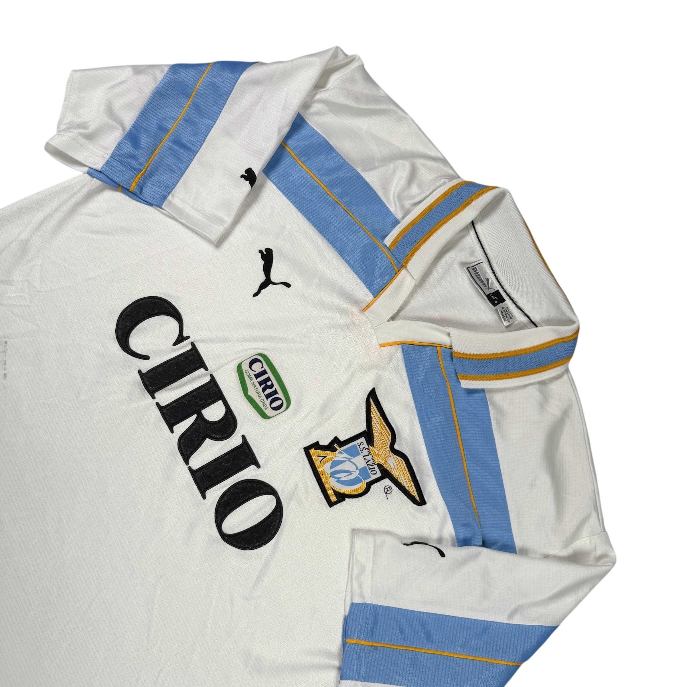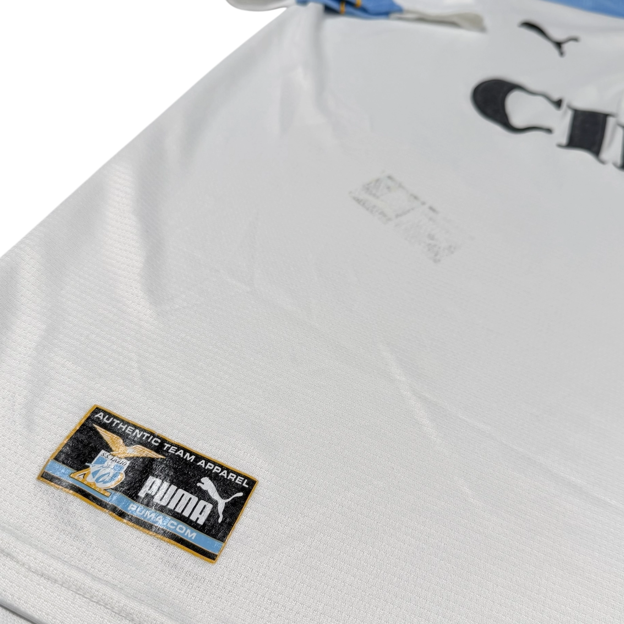 Note IFS : 8/10 – Transfert de l’étiquette du bas du maillot vers la face avant, ce qui a créé une tache visible. Le reste est très bien conservé. Nous n’avons pas testé tous les produits détachants, il est possible que cela s’atténue avec un peu d’huile de coude. Sponsor mythique Cirio en feutrine, écusson du centenaire brodé et écusson du club en excellent état pour ce maillot historique et rare du centenaire de la Lazio. Une pièce qui renvoie directement à l’époque Alessandro Nesta, Filippo Inzaghi, Pavel Nedvěd. Iconic.