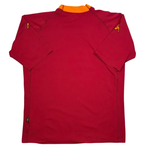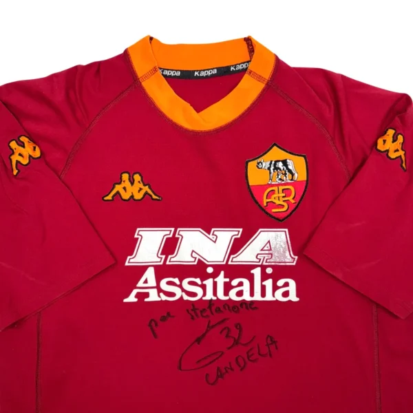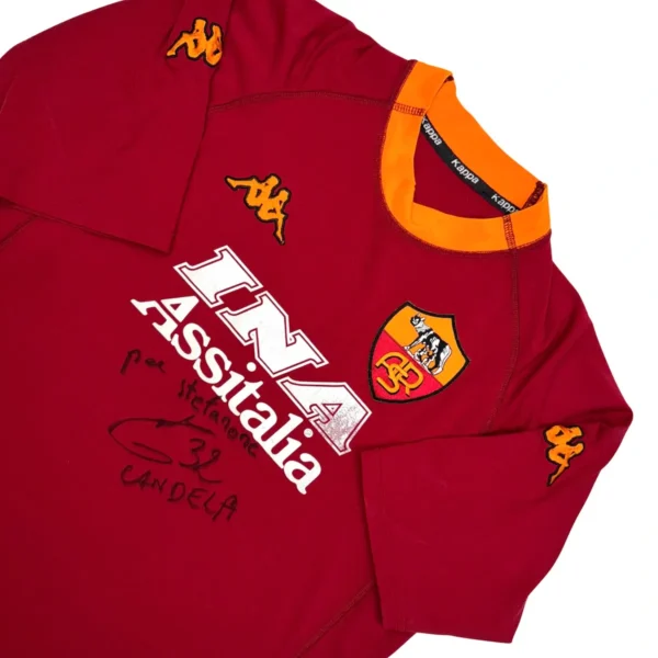 Note IFS : 8/10 – Rare maillot vintage de la Roma, signé par Vincent Candela. Le sponsor est usé, et le bas du maillot légèrement décousu. Une vraie pièce de collection à afficher fièrement, mais clairement pas un maillot à porter au quotidien… sauf si t’assumes de passer pour un zozo.