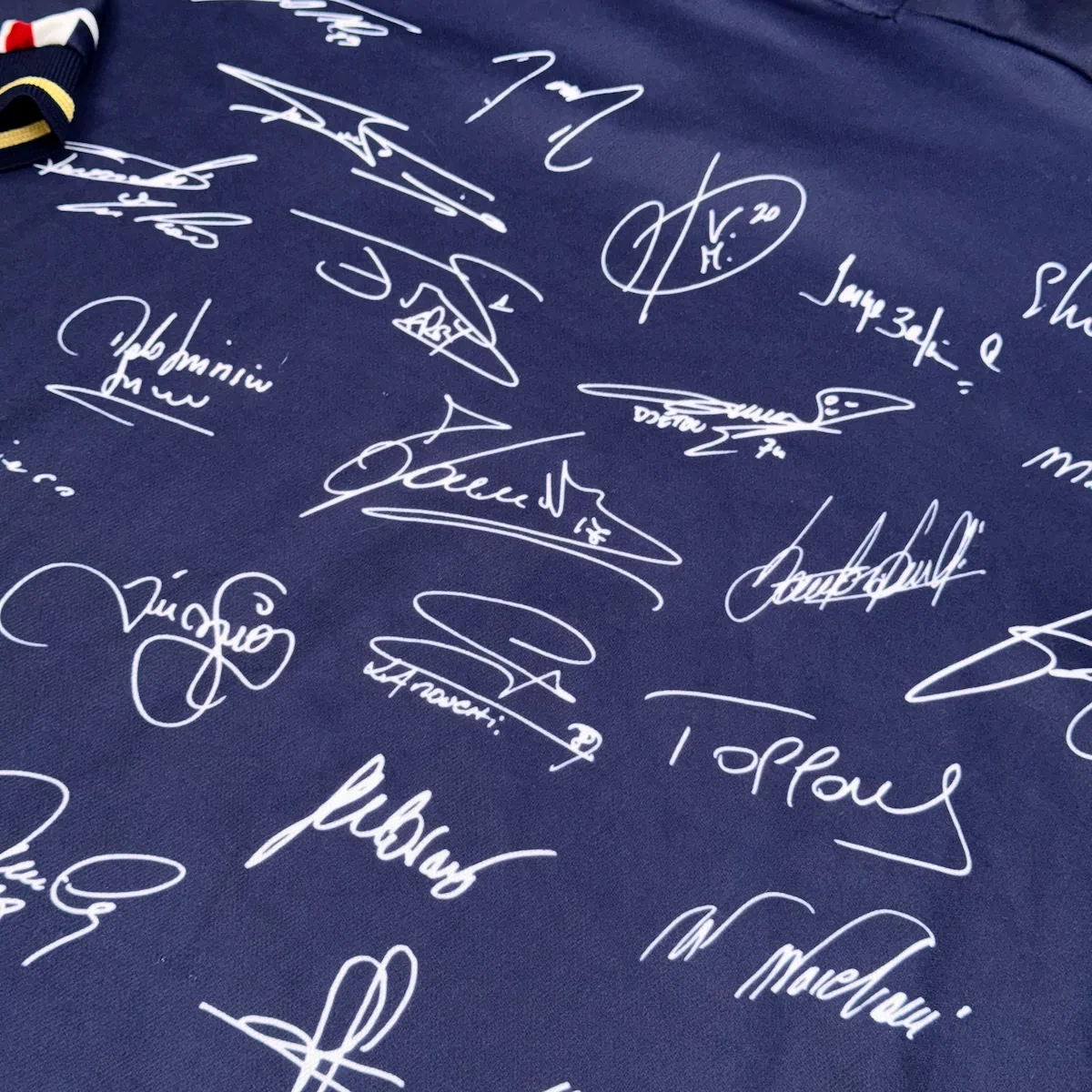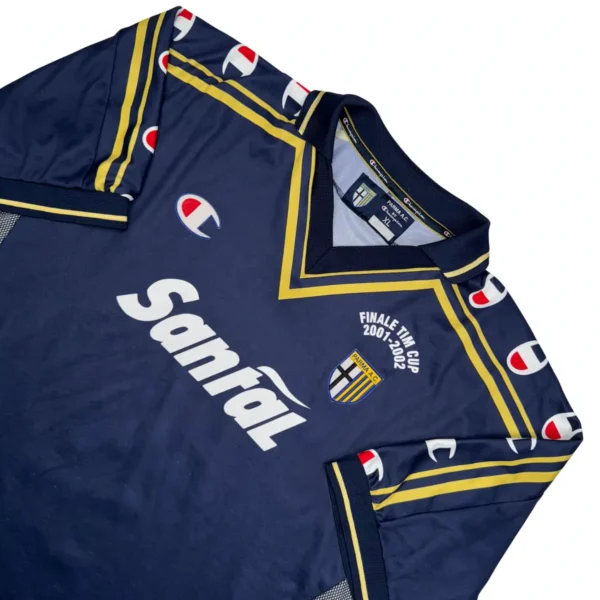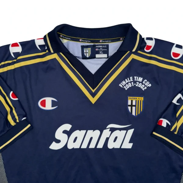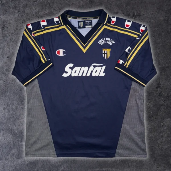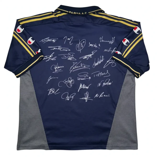 Note IFS : 9/10 – Maillot third spécial de Parme 2000-2001 en excellente condition. Logos du club et de la marque Champion en feutrine, signatures sublimées et incrustées au dos. Modèle collector, peu courant, avec une vraie touche unique.