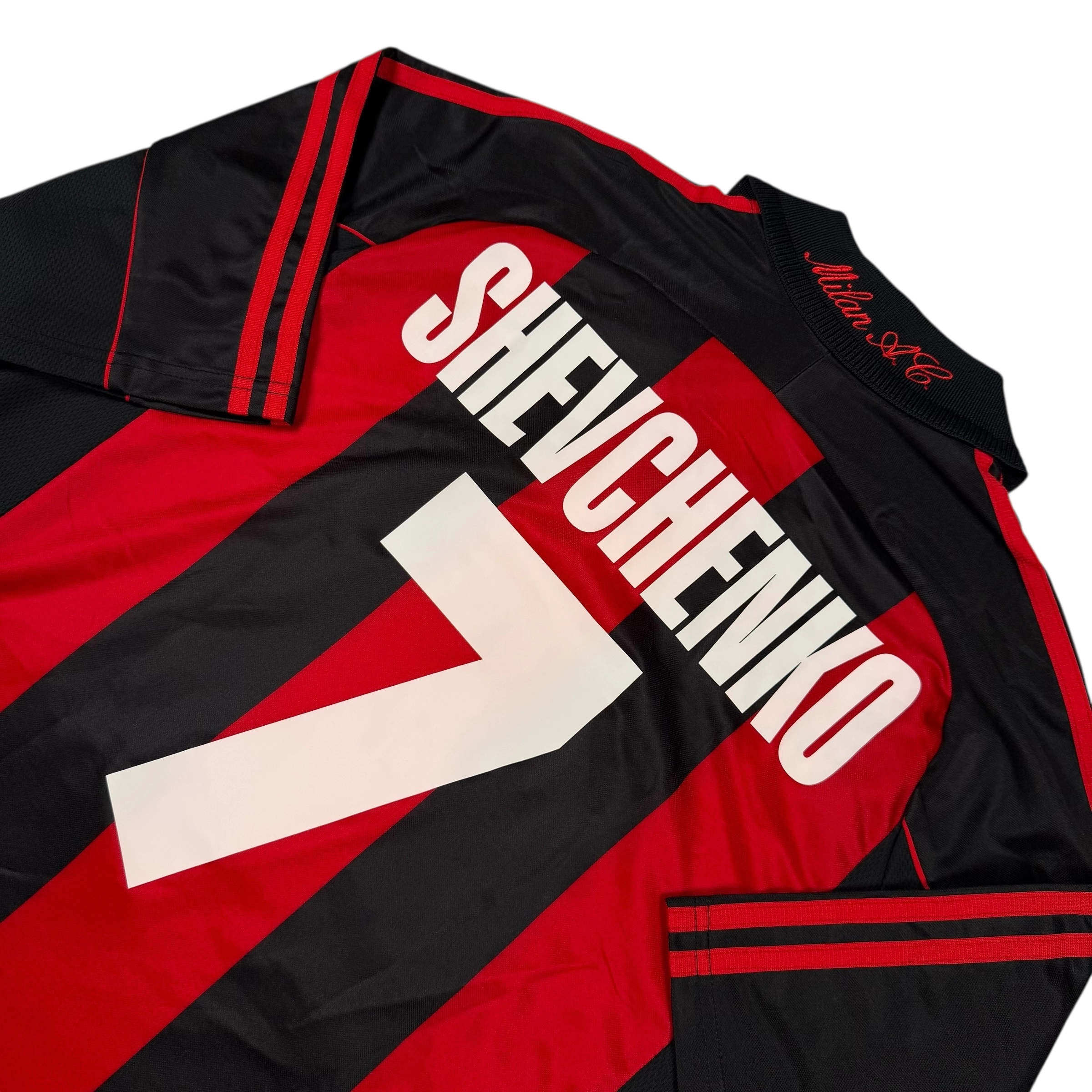 Note IFS : 9/10 – Rare maillot de l’AC Milan porté sur deux saisons, en excellente condition générale. À noter que le flocage d’Andriy Shevchenko est non officiel, point pris en compte dans le prix, qui est donc adapté. Hors flocage, le maillot est bien conservé et complet, sachant que ce modèle dépasse facilement les 200 € minimum dans cet état avec un flocage officiel.