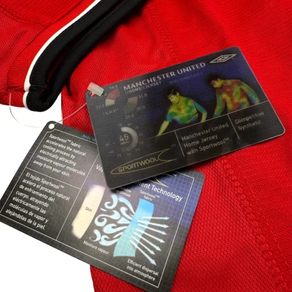 Note IFS : Neuf + étiquettes – Ce maillot, avec ses étiquettes d’époque encore accrochées, c’est une dinguerie. Un bijou signé Umbro, le tout dernier avant l’arrivée de Nike à United. Le sponsor Vodafone en feutrine ajoute une touche encore plus nostalgique, pile comme à l’époque. Et cette fameuse étiquette animée avec la techno SportWool… on dirait un jouet des paquets de Kellogg’s. Si tu l’enlèves, t’enlèves direct une partie de sa valeur. Franchement, c’était à deux doigts de rester dans la collection IFS.