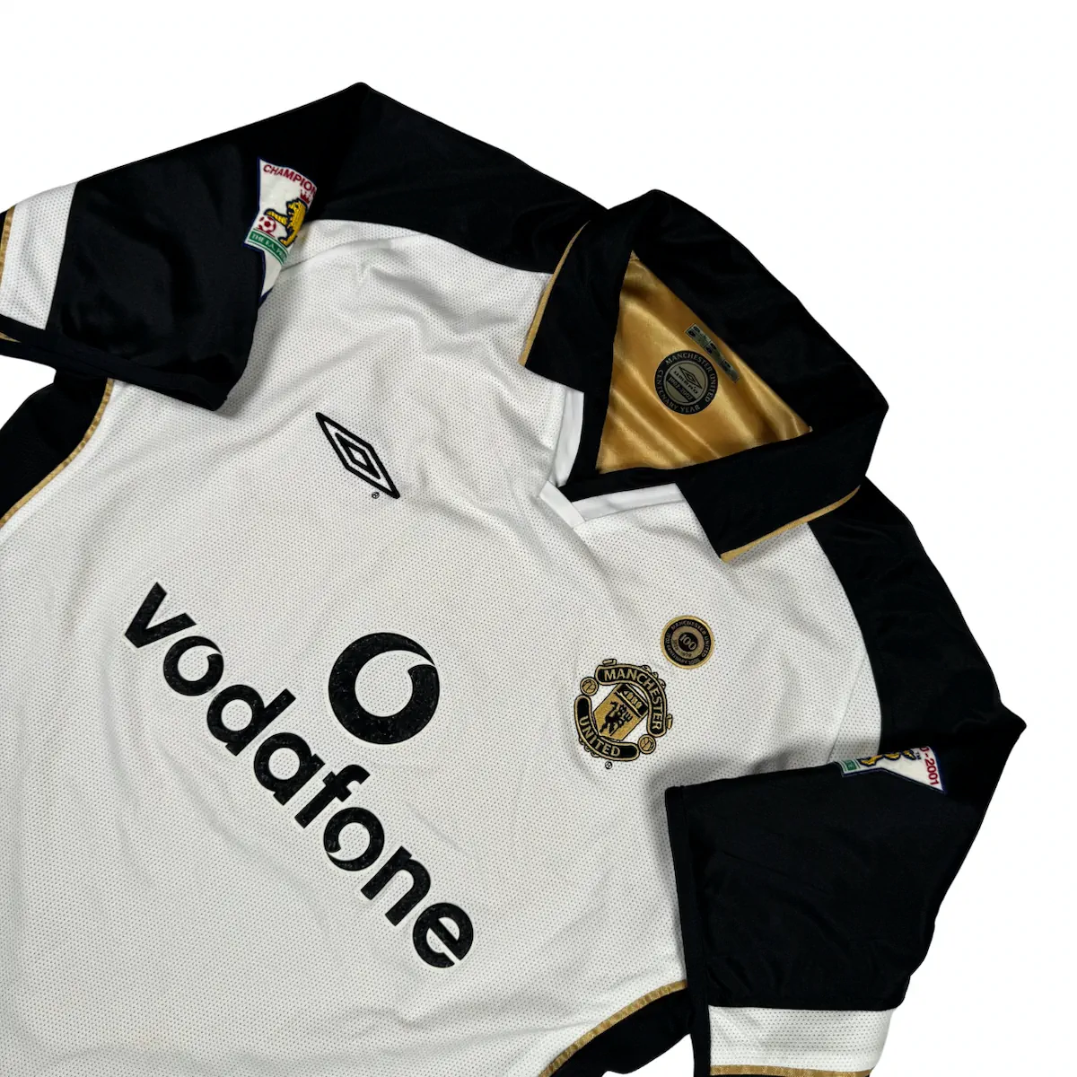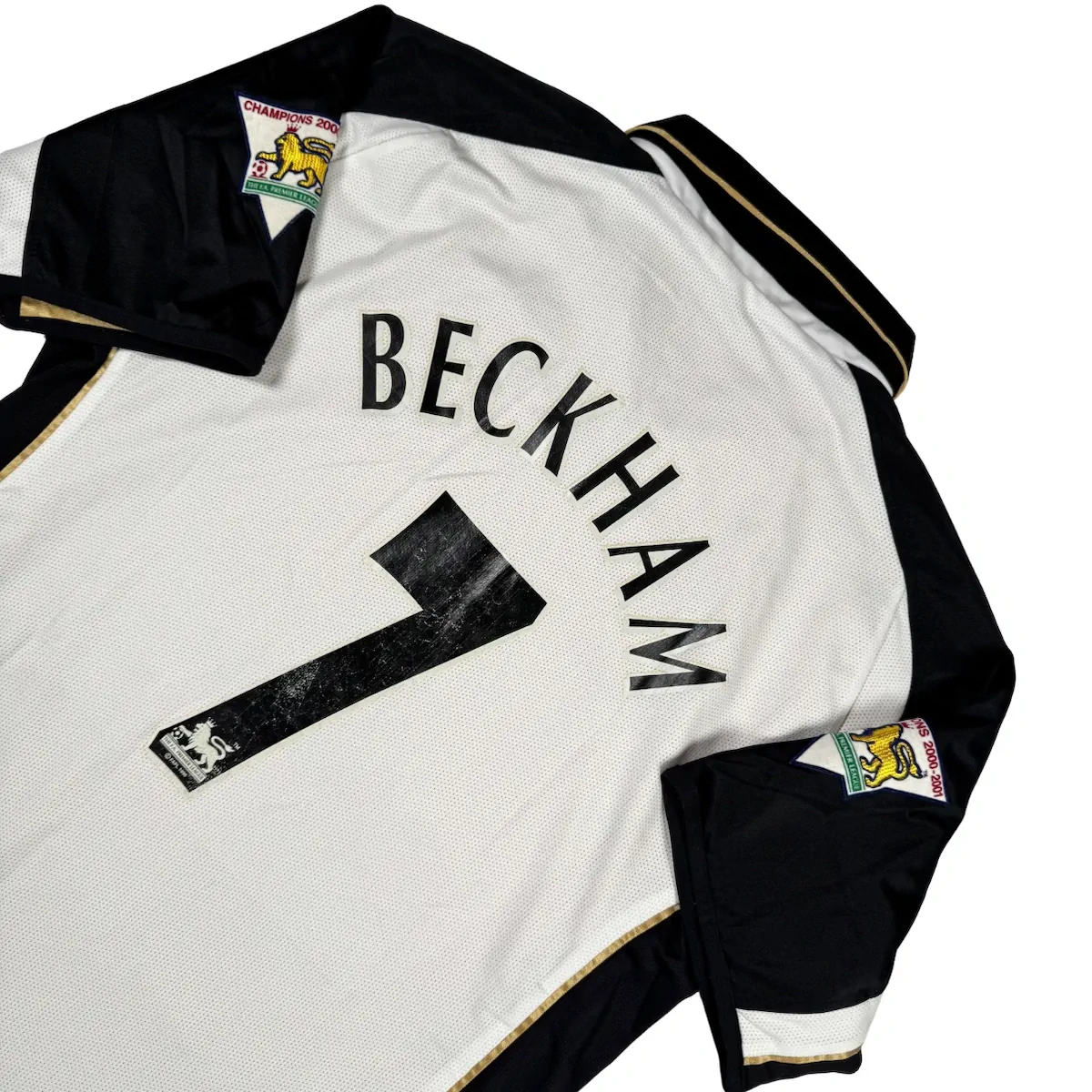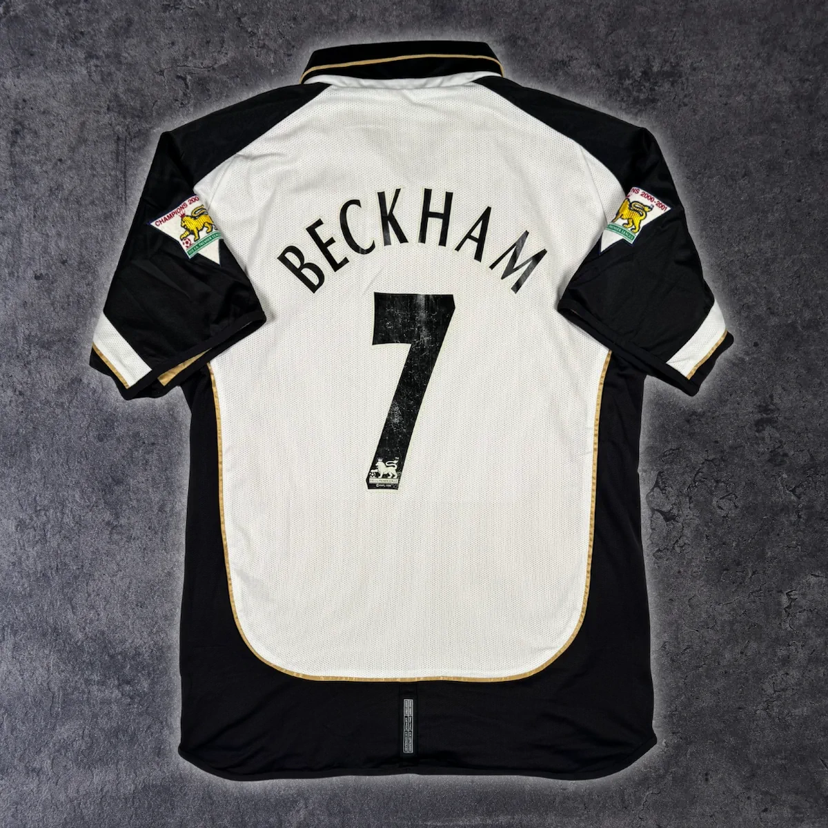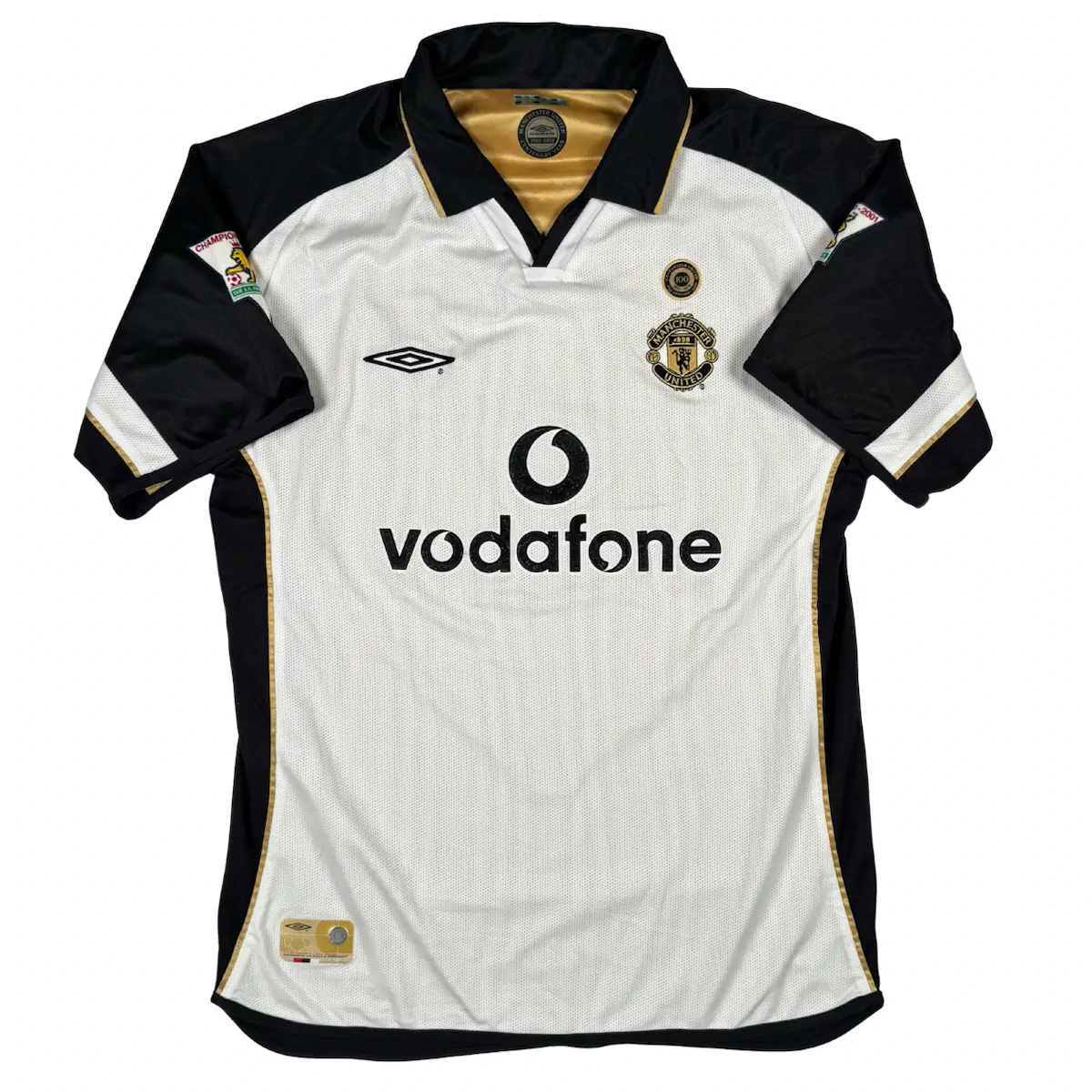 Note IFS : 9/10 – Maillot extérieur / third réversible de Manchester United, modèle du centenaire (1902-2002). Côté extérieur floqué Beckham, avec patchs officiels Premier League en feutrine portant la mention Champions 2000/01. Le flocage Beckham est officiel, légèrement usé au niveau du numéro 7. Sponsor Vodafone en feutrine, typique et Iconic de cette époque. Une pièce rare, complète et recherchée, surtout dans cette version réversible.