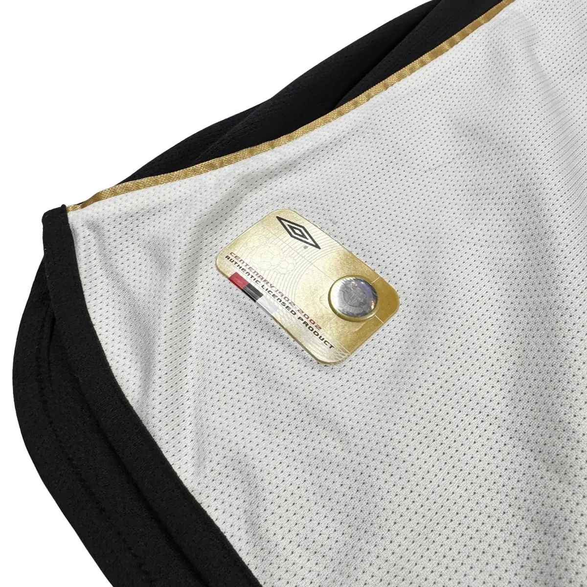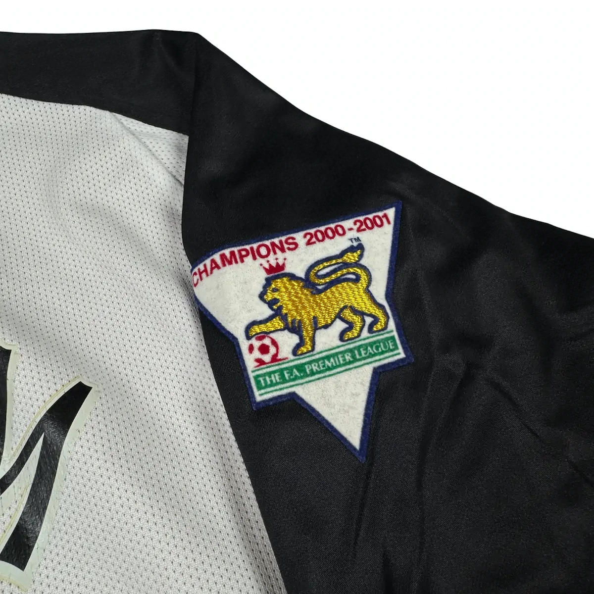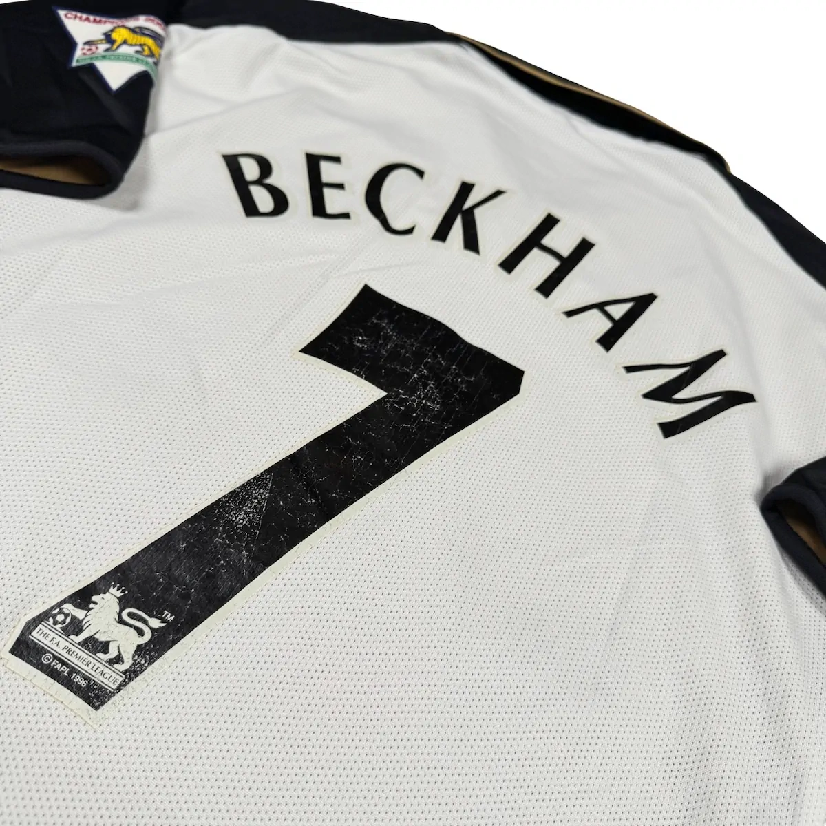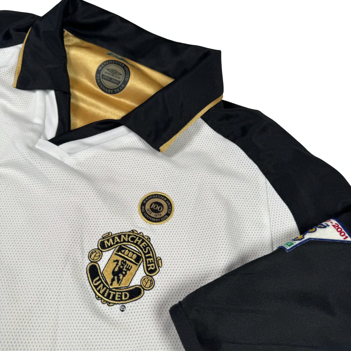 Note IFS : 9/10 – Maillot extérieur / third réversible de Manchester United, modèle du centenaire (1902-2002). Côté extérieur floqué Beckham, avec patchs officiels Premier League en feutrine portant la mention Champions 2000/01. Le flocage Beckham est officiel, légèrement usé au niveau du numéro 7. Sponsor Vodafone en feutrine, typique et Iconic de cette époque. Une pièce rare, complète et recherchée, surtout dans cette version réversible.