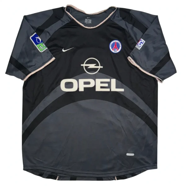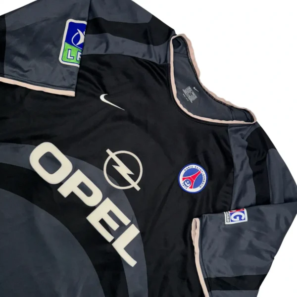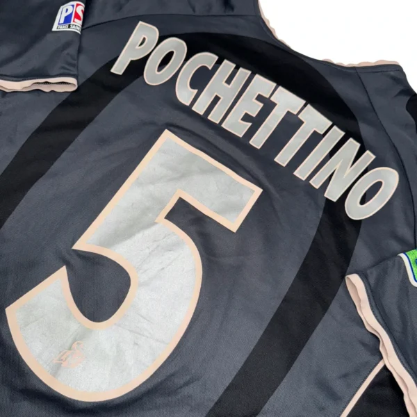 Note IFS : 9/10 – Maillot du PSG très proche du 10/10. Sponsor Opel en feutrine, comme neuf et bien blanc, ce qui est rare. Flocage officiel LNF de Pochettino hyper bien conservé, tout comme le patch en feutrine LFP sur la manche. Ultra rare dans cette config. Collector, époque R10, Okocha & compagnie !