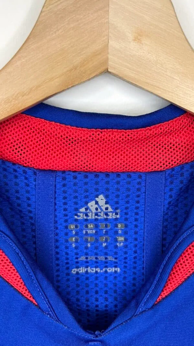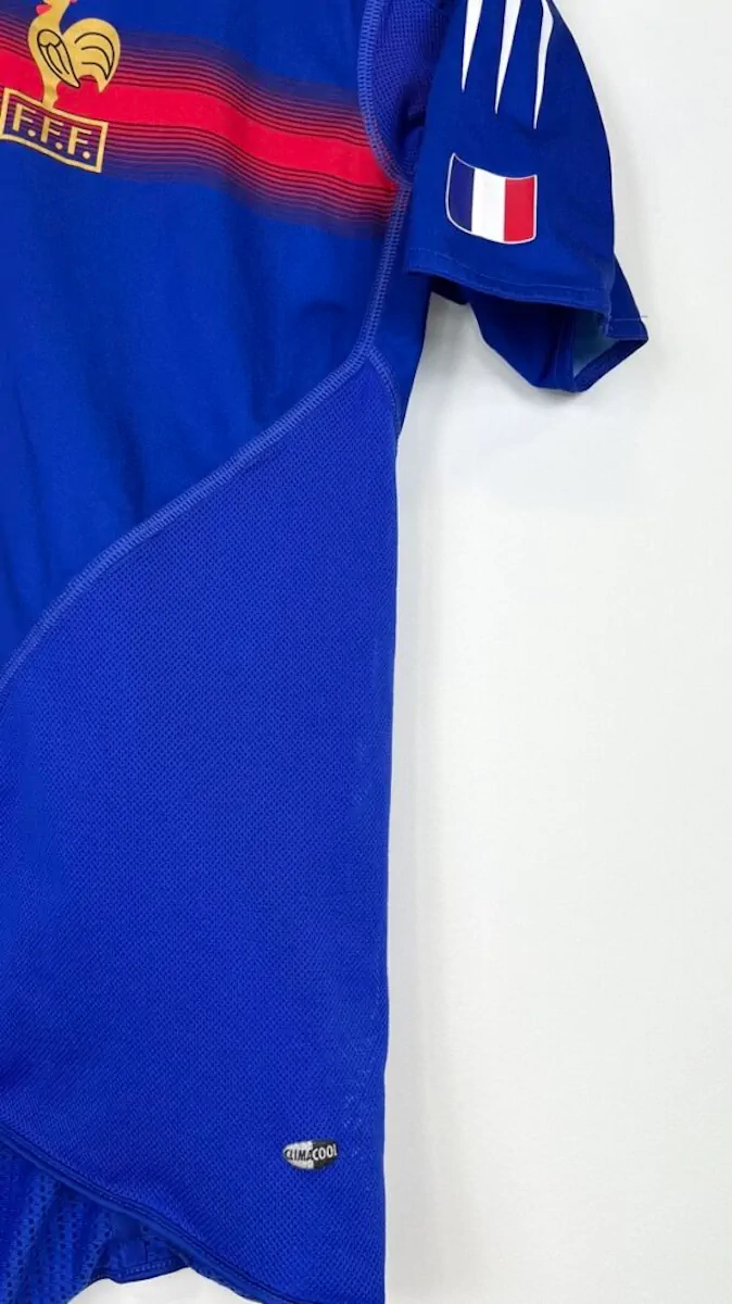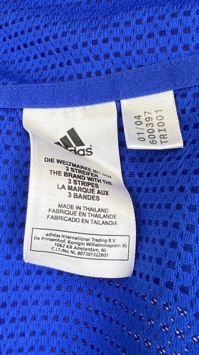 Note IFS : 9/10 – Excellent état général pour ce maillot de l’équipe de France. Quelques légères bouloches (voir photos). Il s’agit d’un maillot rare issu du stock professionnel des Bleus, non commercialisé à l’époque ! Le coq et le logo Adidas sont thermocollés contrairement aux versions boutique qui sont brodés. Quelques joueurs de l’effectif : Zidane, Thierry Henry, Thuram, Makelele, Barthez, Pirès… Un effectif assez incroyable !