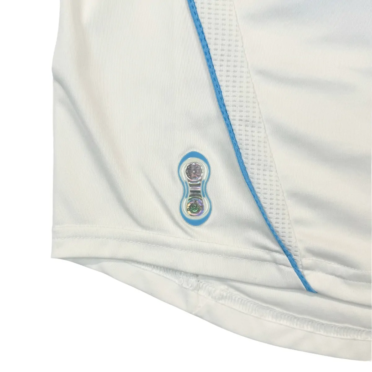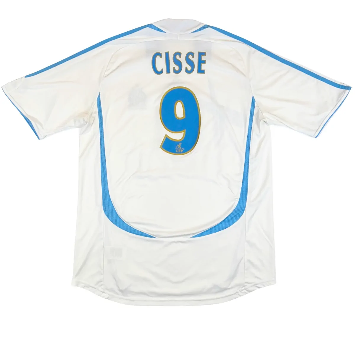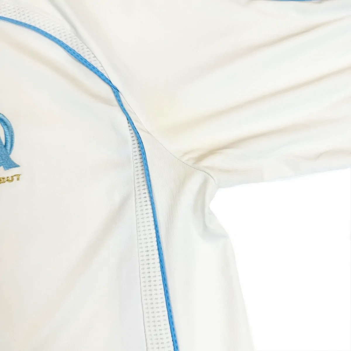 Note IFS : 9/10 – Excellente condition pour ce rare maillot collector. Très légèrement marqué en dessous des bras, sinon c’est un 10/10. L’Iconic sponsor Neuf en feutrine est parfaitement conservé. Le flocage officiel LFP de Djibril Cisse est hyper bien conservé. Djibril au Vélodrome avec ses lignes jaunes dans les cheveux… Iconic !