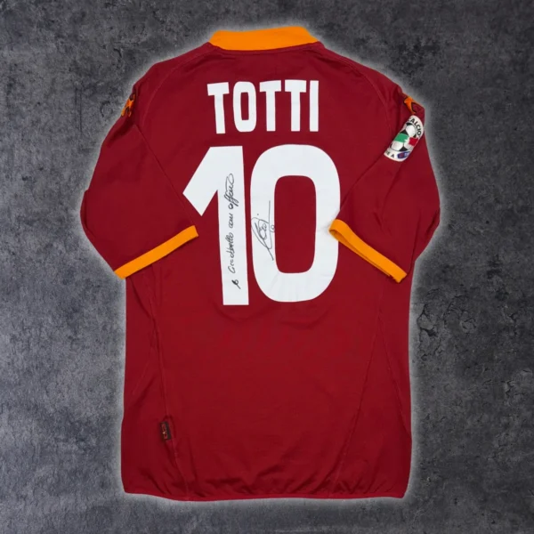 Note IFS : 9/10 – Maillot ultra rare de la Roma avec les patchs Lega Calcio et Coppa Italia, signé de la main du légendaire Francesco Totti. Une pièce exceptionnelle, avec une provenance fiable via un vendeur de confiance que nous connaissons personnellement. Un vrai trésor pour les collectionneurs.