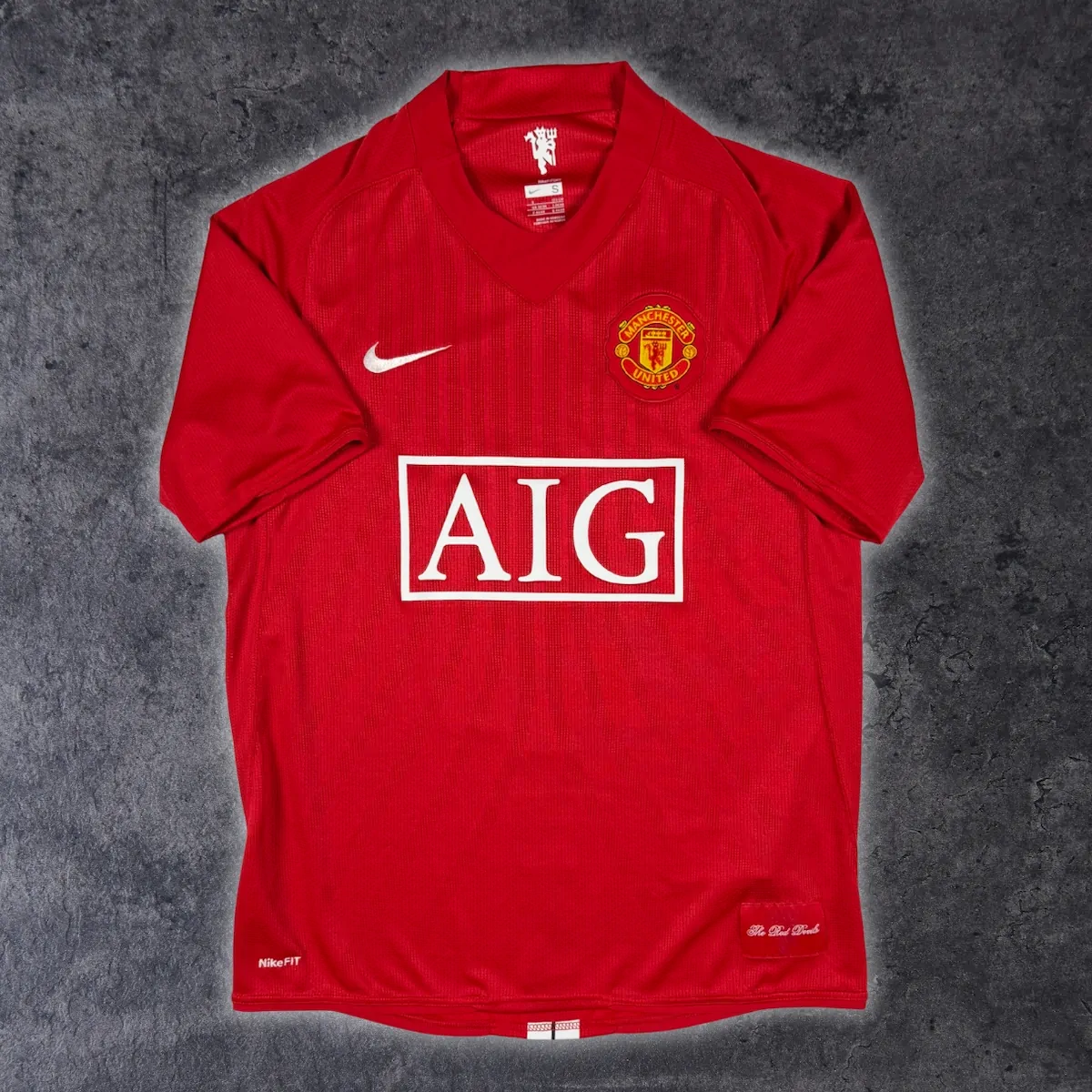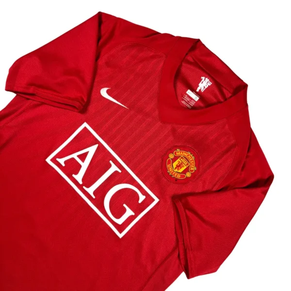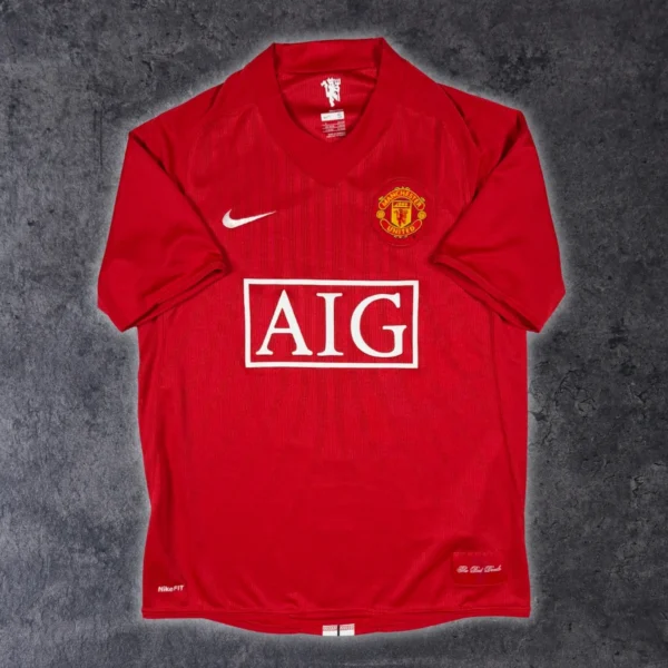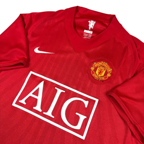 Note IFS : 10/10 – Maillot mythique de Manchester United saison 2007-09, en parfait état. Très rare de retrouver le sponsor AIG et les bandes blanches au dos aussi bien conservés. Iconic, historique, sûrement l’un des plus beaux et des plus symboliques maillots de l’histoire des Red Devils.