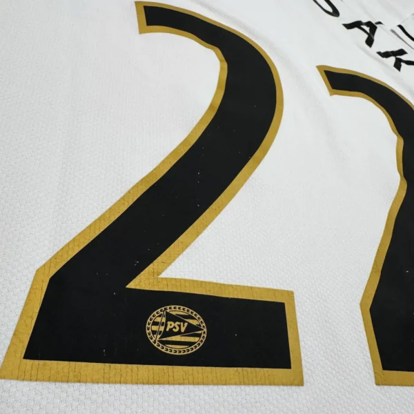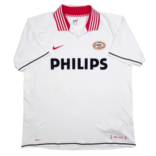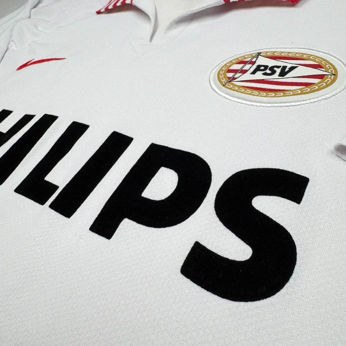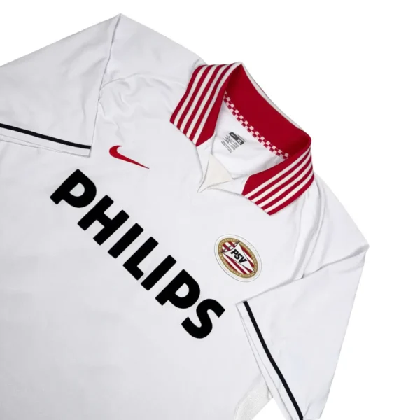 Note IFS : 9/10 – Excellente condition générale. Un peu d’usure sur le flocage officiel, mais le mythique sponsor Philips en feutrine est impeccable. Col aux couleurs du club, magnifique détail qui donne tout son charme à ce superbe et rare maillot vintage du PSV.