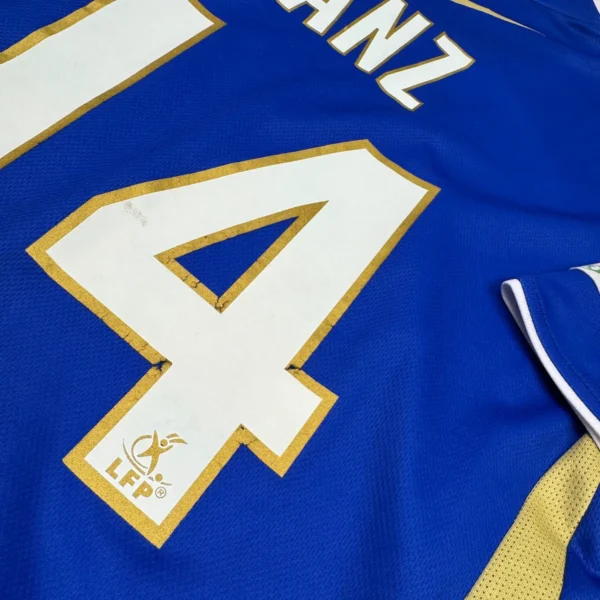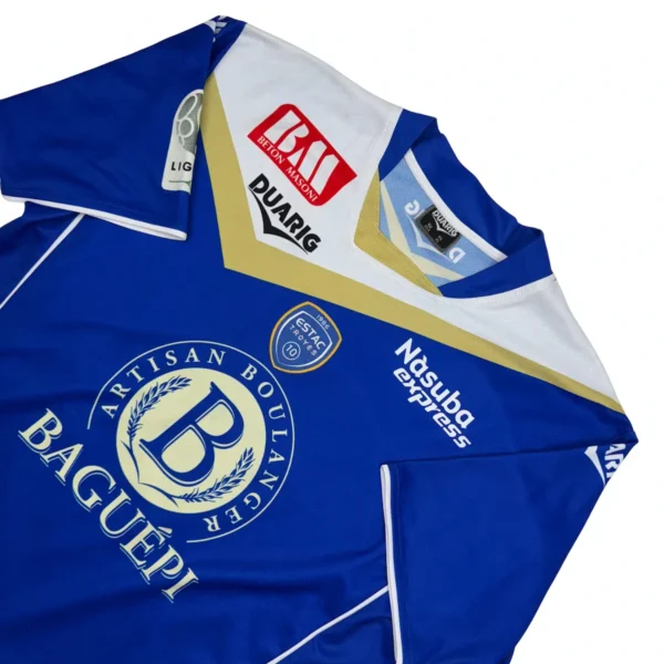 Note IFS : 9/10 – Maillot domicile de l’ESTAC préparé et/ou porté par Gaël Sanz, une vraie pièce à l’ancienne avec le sponsor principal directement sublimé dans le tissu. Le flocage dorsal présente une légère usure sur les chiffres, mais le nom est impeccable. Patch officiel de la Ligue 2 sur la manche. Modèle original et typiquement français. Gaël Sanz, joueur fidèle au club entre 2002 et 2011 après des passages au LOSC et à Beauvais. Un maillot rare et collector pour les amateurs de foot hexagonal.