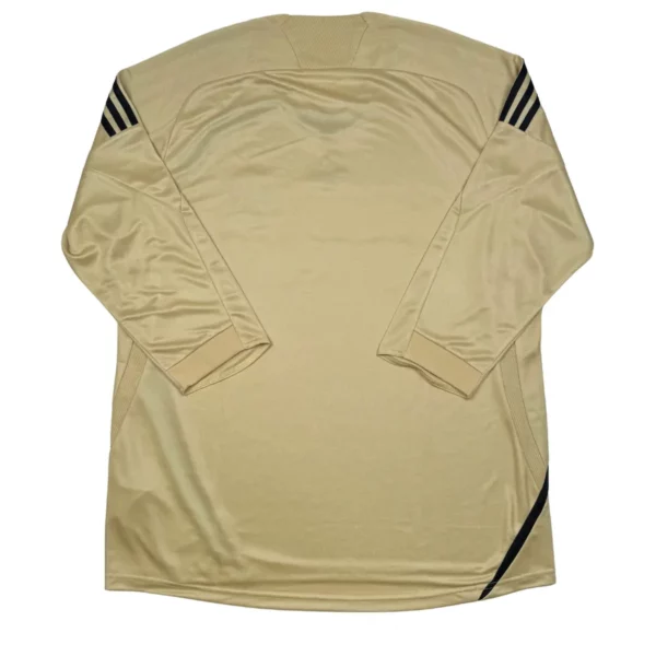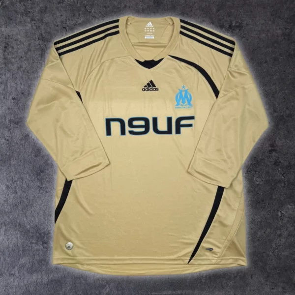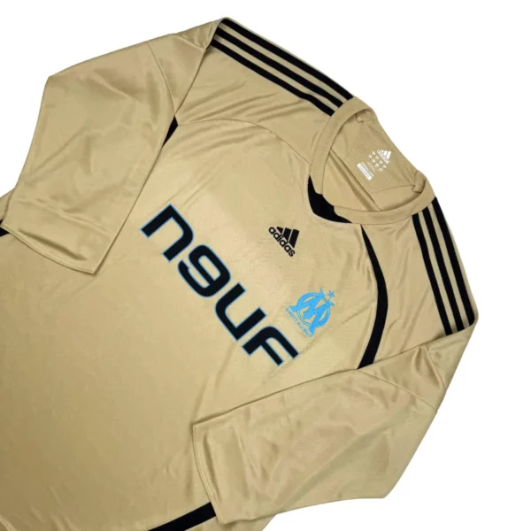 Note IFS : 10/10 – Parfait. Troisième maillot 2008-09 de l’OM avec les fameuses manches 3/4. Le doré a bien gardé son éclat et tout est nickel y compris le sponsor en feutrine !