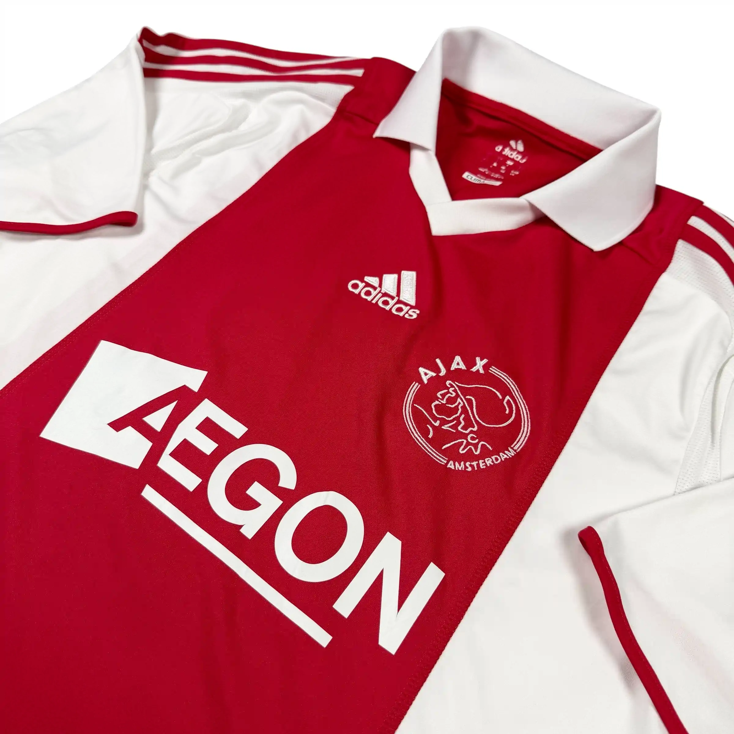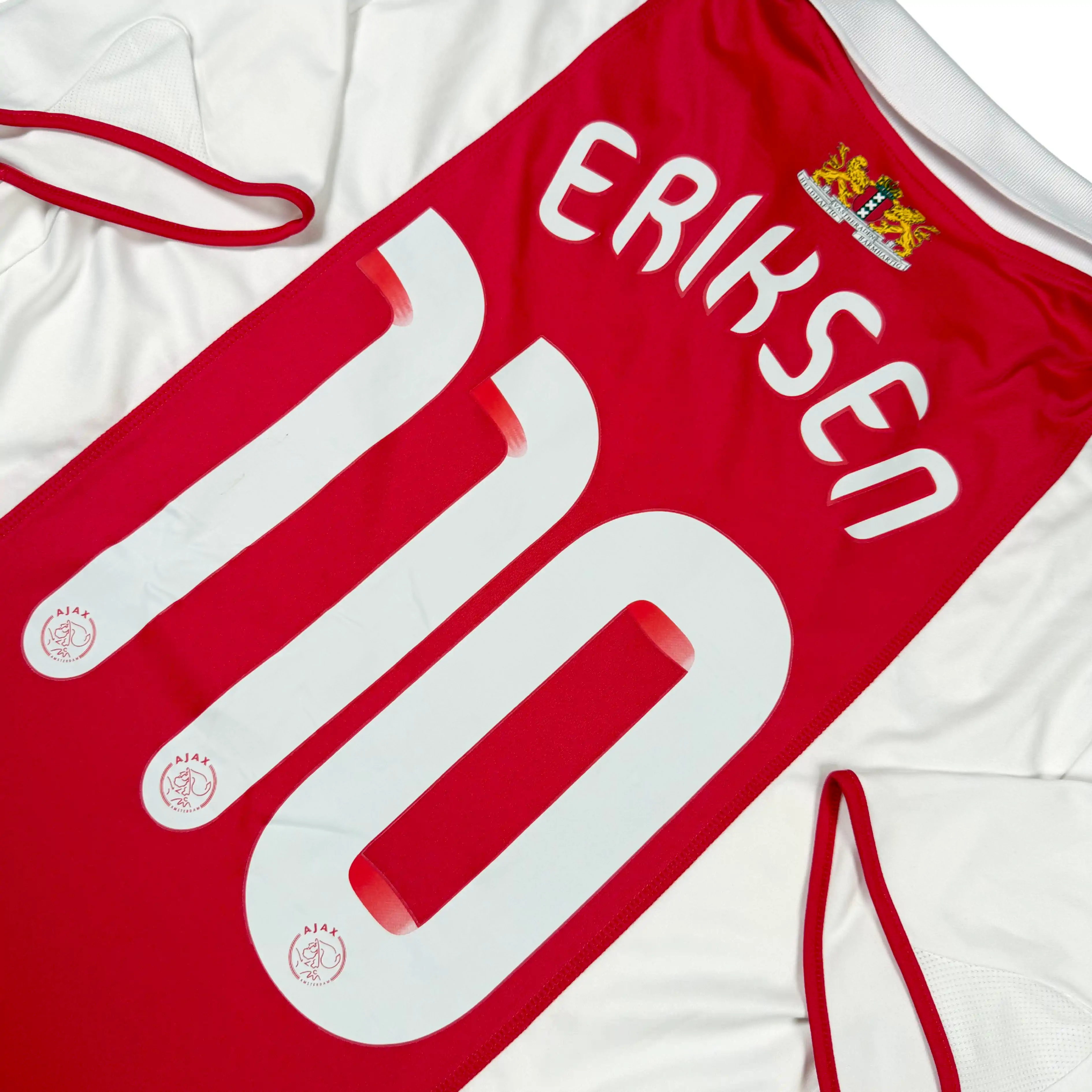 Note IFS : 9/10 – Maillot vintage de l’Ajax Amsterdam en excellent état général, inscriptions de taille dans la nuque partiellement effacé mais invisible une fois porté, flocage officiel célébrant les 110 ans du club et floqué Eriksen, qui débute en pro le 17 janvier 2010 face à Breda à 17 ans, une pièce forte et chargée d’histoire.