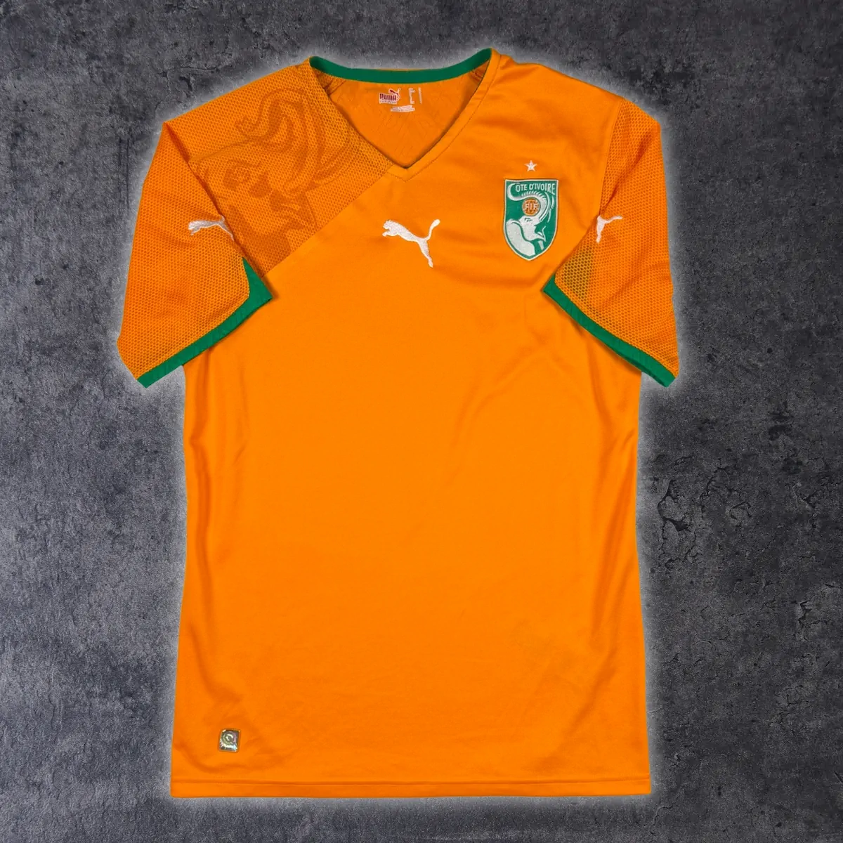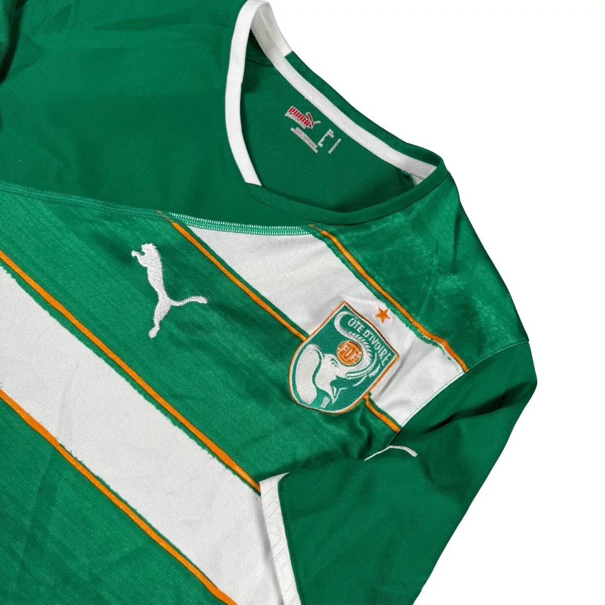 Note IFS : 10/10 – Parfait. Maillots domicile de la Côte d’Ivoire par Puma au design bien travaillé. On pense forcément à Didier, pas besoin de dire le nom si tu connais le foot.