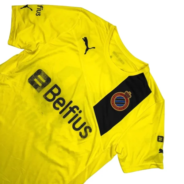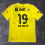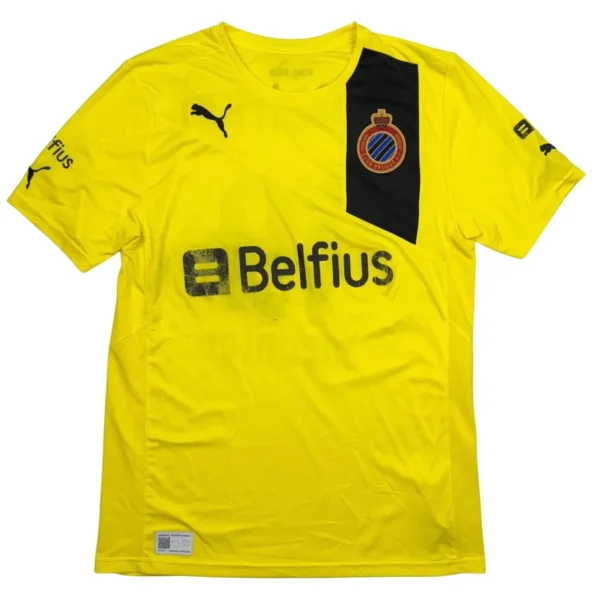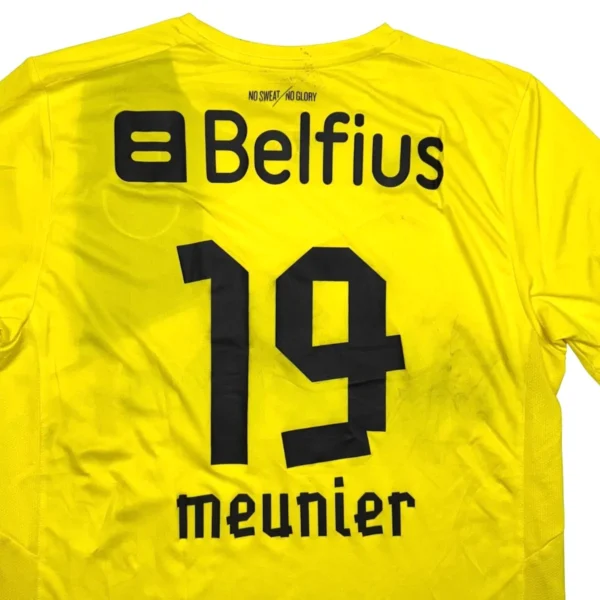 Note IFS : 8/10 – Très bon état pour ce maillot extérieur de Bruges floqué Thomas Meunier après son arrivée de Virton. Malheureusement on l’a un peu flingué au lavage, avec un transfert du flocage sponsor qui fait descendre la note de 10/10 à 8/10. Eh oui, ça peut nous arriver aussi ! Idéal pour la collection si tu veux l’encadrer côté flocage, cette face est plutôt bien épargnée !