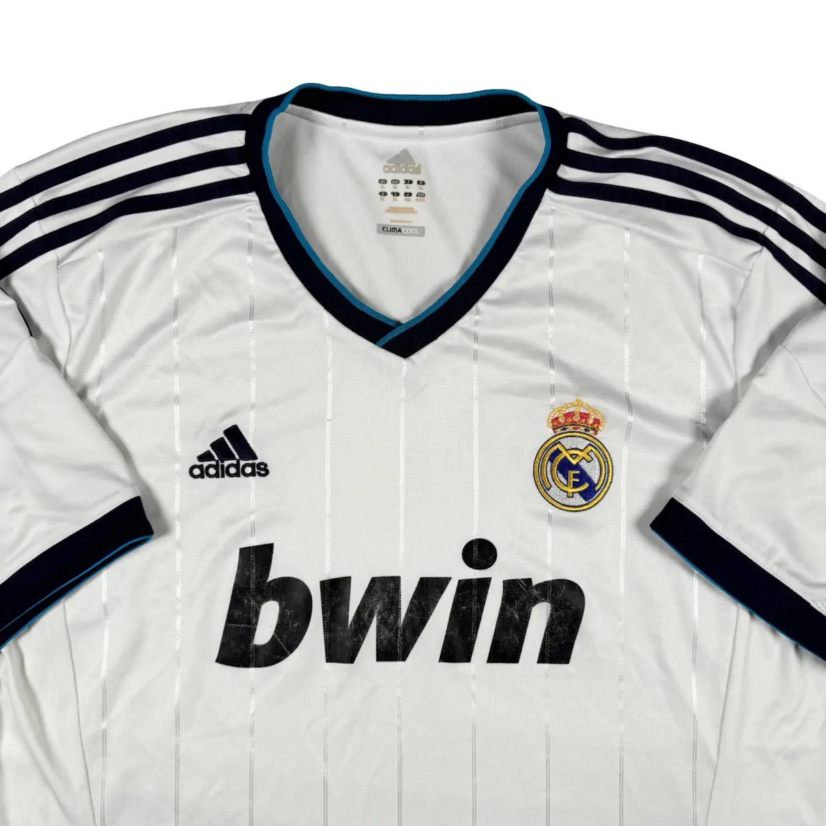 Note IFS : 8/10 – Maillot domicile du Real Madrid saison 2012-13 avec sponsor légèrement usé, mais parfaitement conservé pour le reste. Patch spécial des 110 ans du club sur la manche, une belle pièce chargée d’histoire pour les fans des Merengues. On pense forcément à CR7 à son prime.