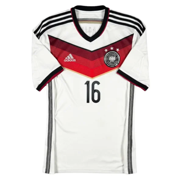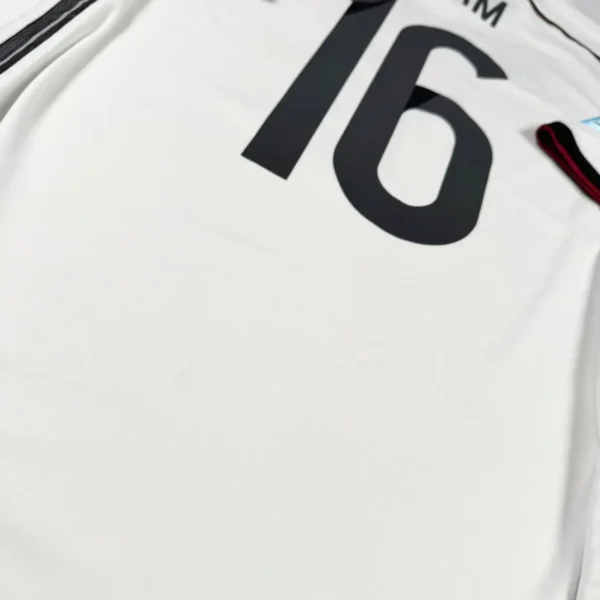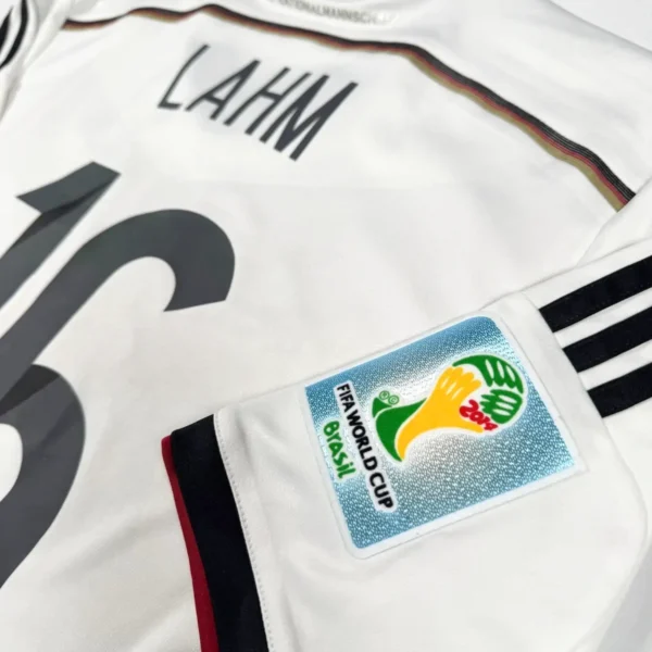 Note IFS : 9/10 – Excellent état pour ce maillot de l’Allemagne 2014/15. Trace très légère, visible uniquement à la lumière. Patchs Coupe du Monde 2014 impeccables et flocage de la légende Lahm comme neuf. Une superbe pièce de la Mannschaft.