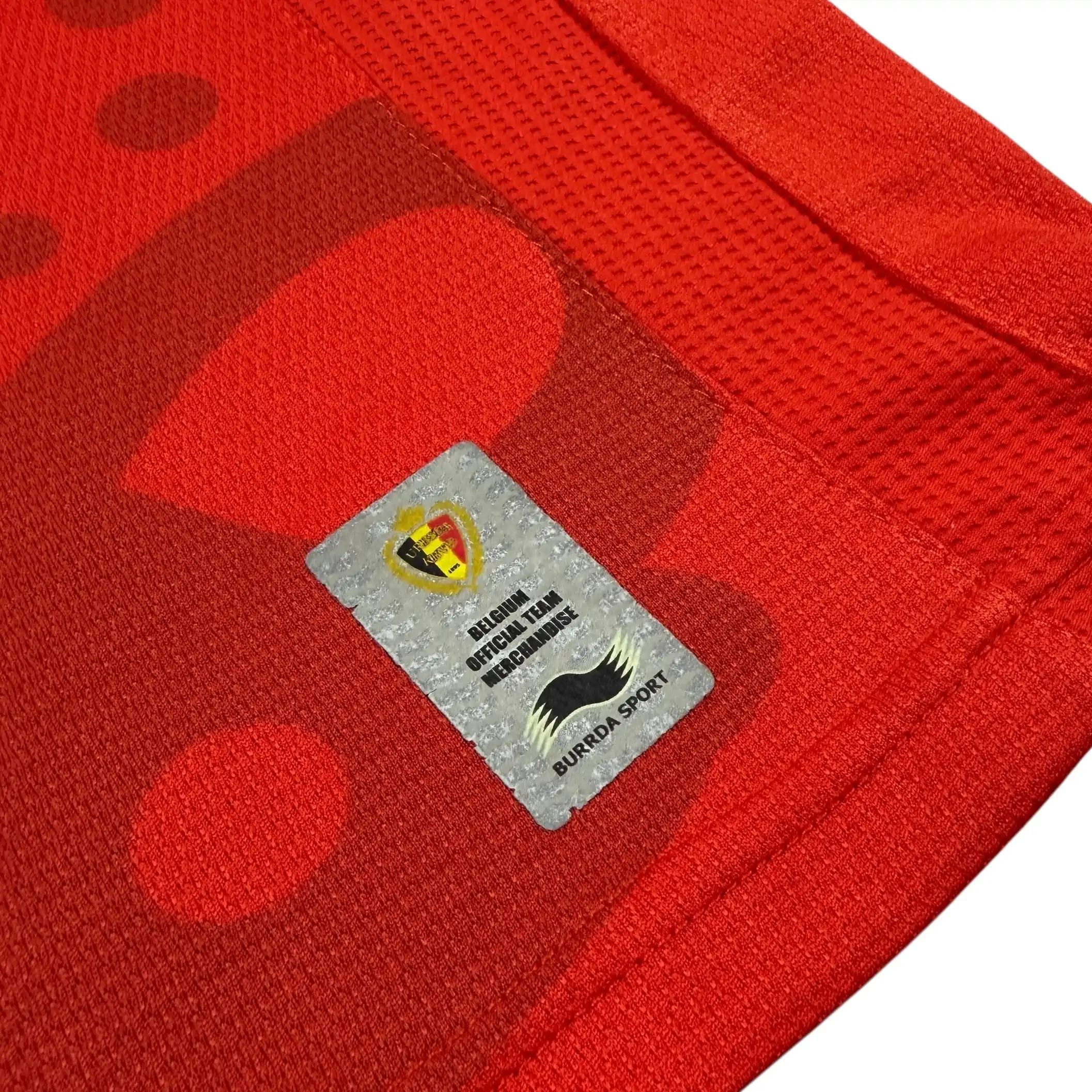 Note IFS : 8/10 – Très bon état général, quelques fils tirés mais rien de bien méchant. L’ensemble du maillot est très bien conservé. Ce maillot taille assez moulant. Ce maillot officiel marquera l’arrivée des belges dans l’élite du football mondial.