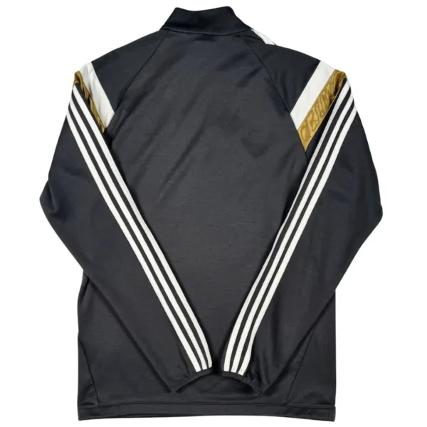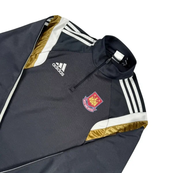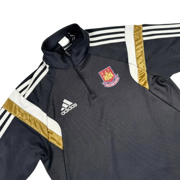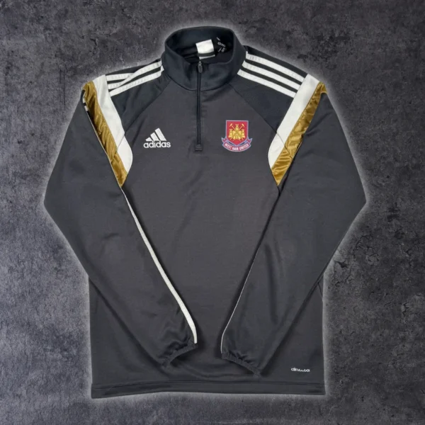 Note IFS : 9/10 – Sweat 1/4 zip de West Ham au pur style hooligan londonien. L’écusson floqué imite la broderie pour un rendu old school hyper stylé. Logo Adidas brodé, mention Climacool partiellement effacée, qui ne se voit quasiment pas au porté. Une belle pièce vintage pour les vrais fans des Hammers.