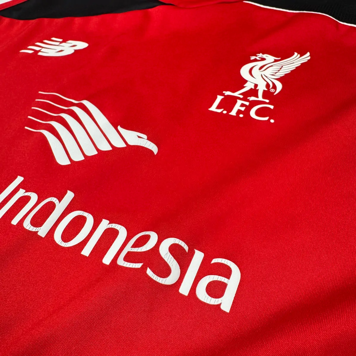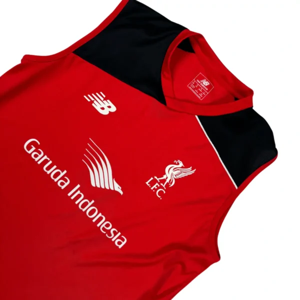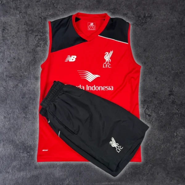Note IFS : 8/10 – Ensemble complet Liverpool débardeur + short. Sponsor et logo New Balance légèrement usés au dos du haut, tandis que le short est en parfaite condition.
