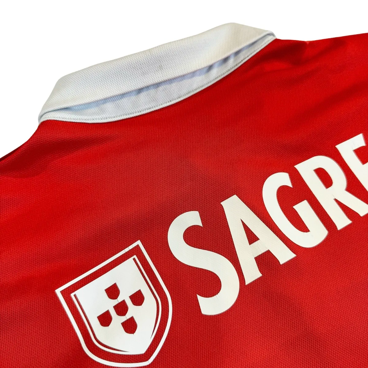 Note IFS : 8/10 – Très bon état général, l’écusson est floqué et est comme neuf. Le sponsor est légèrement usé et la couleur blanche à un peu perdu de son éclat (voir photos). Á noter le petit détail sympa : pour honorer la mémoire de la légende du club, Adidas a inclus une mention de l’âge qu’aurait atteint Eusebio en 2017 : 75 ans. On se rappel de l’initiative remarquable quand en 2014, les joueurs ont décidé de porter des maillots au nom de l’attaquant portugais.