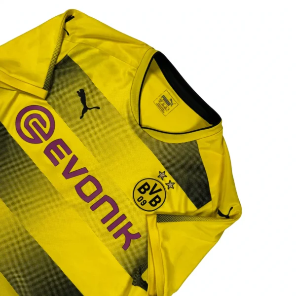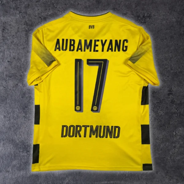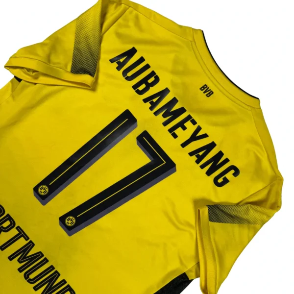Note IFS : 9/10 – Maillot du BVB Dortmund floqué Pierre-Emerick Aubameyang, avec quelques taches au dos. Flocage en parfait état, étiquettes intérieures coupées. Une belle pièce des années où le buteur gabonais marquait but sur but avec le BVB.