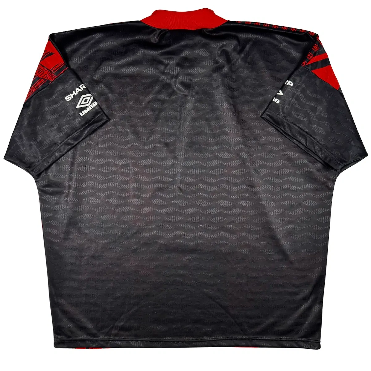 Note IFS : 10/10 – Parfaite condition, maillot comme neuf ! Taille L enfant (13-14 ans). Rare de par le fait qu’il s’agit d’un manches longues, ce maillot comporte également les patchs officiels de la Premier League. Détail sympa : on peut distinguer la statue de la United Trinity dans le maillot (George Best, Denis Law et Sir Bobby Charlton), légendes du club !