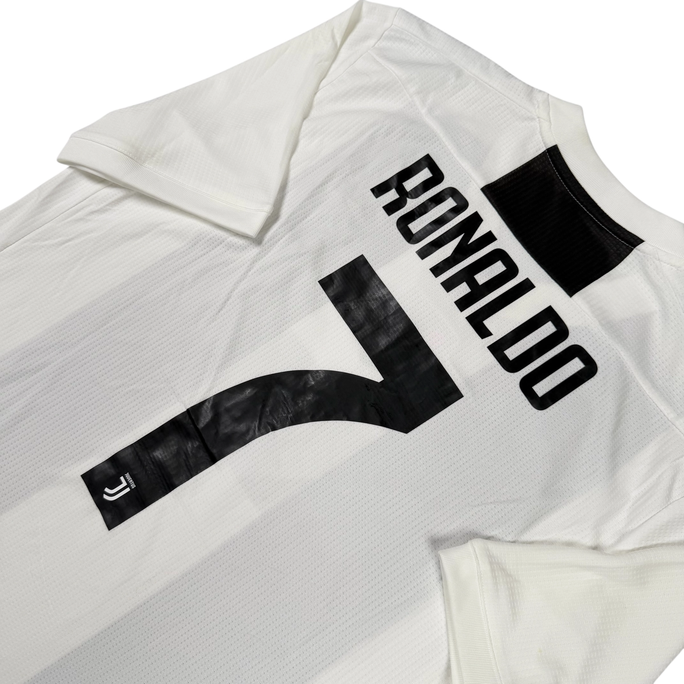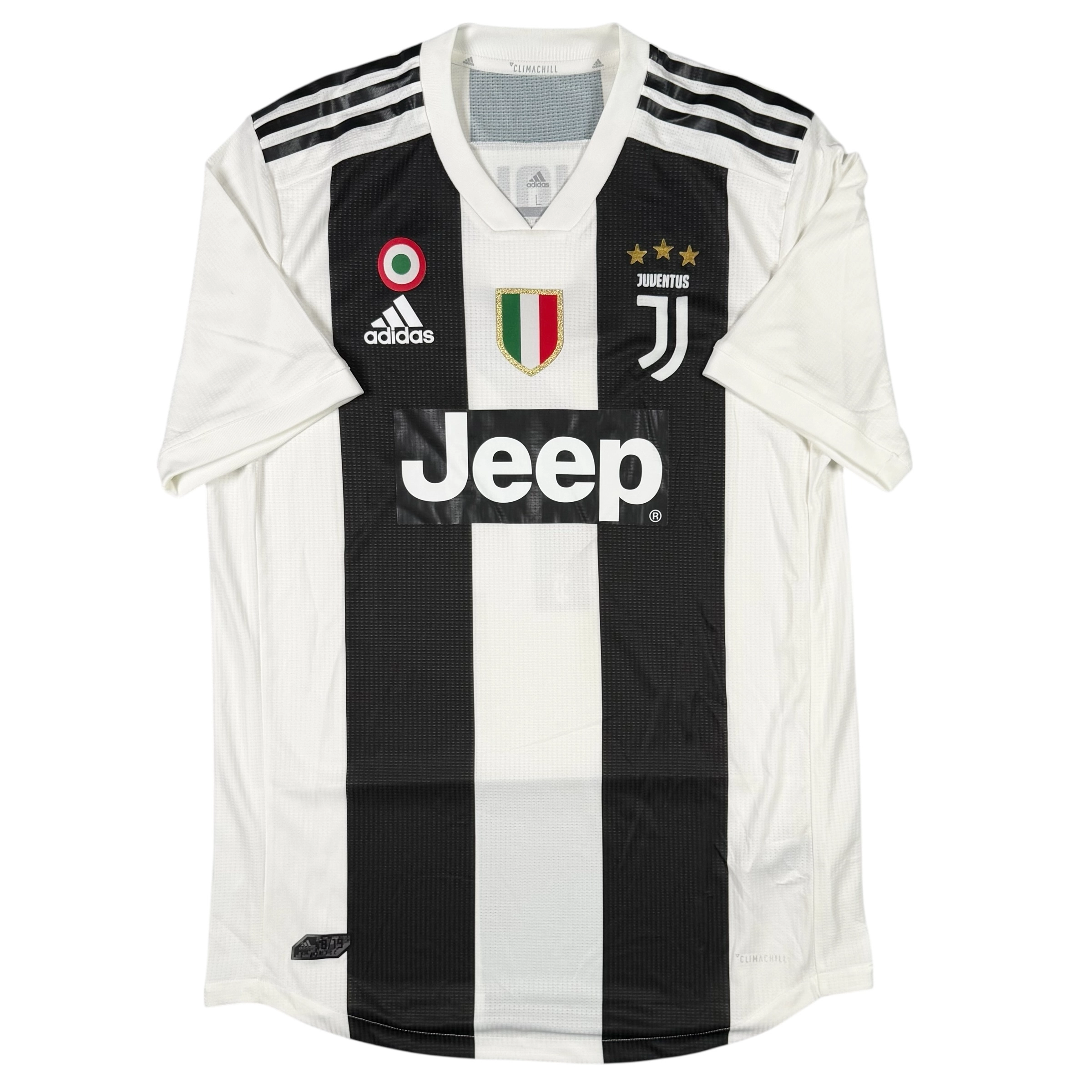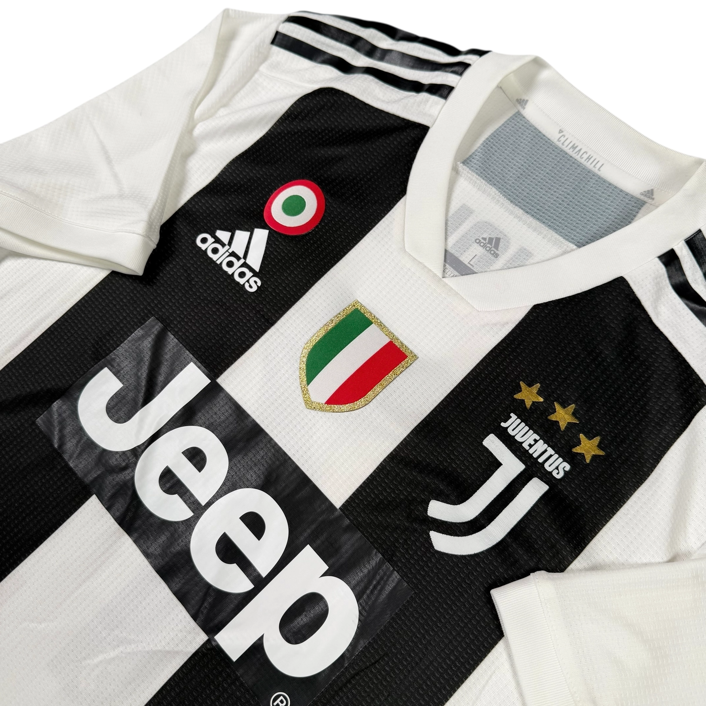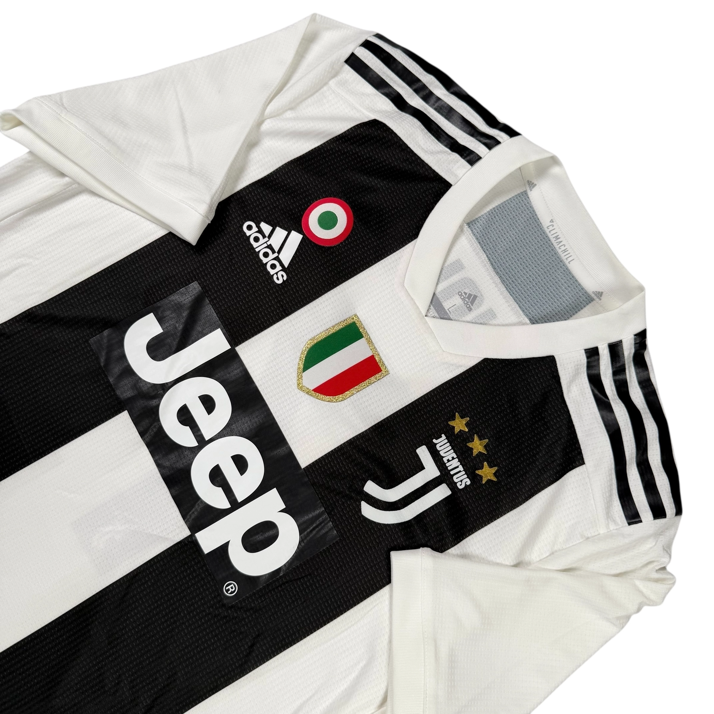 Note IFS : 9/10 – Maillot de la Juventus en version pro, identique à celui porté par les joueurs, avec la technologie Climachill de Adidas, différente du Climacool des versions supporters. Coupe plus fit, logos thermocollés (non brodés), tout comme les bandes Adidas sur les épaules ; le tissu est fin et léger, pensé pour limiter toute gêne à l’effort. Patchs Scudetto et Coppa Italia présents, configuration propre et cohérente pour ce modèle technique.