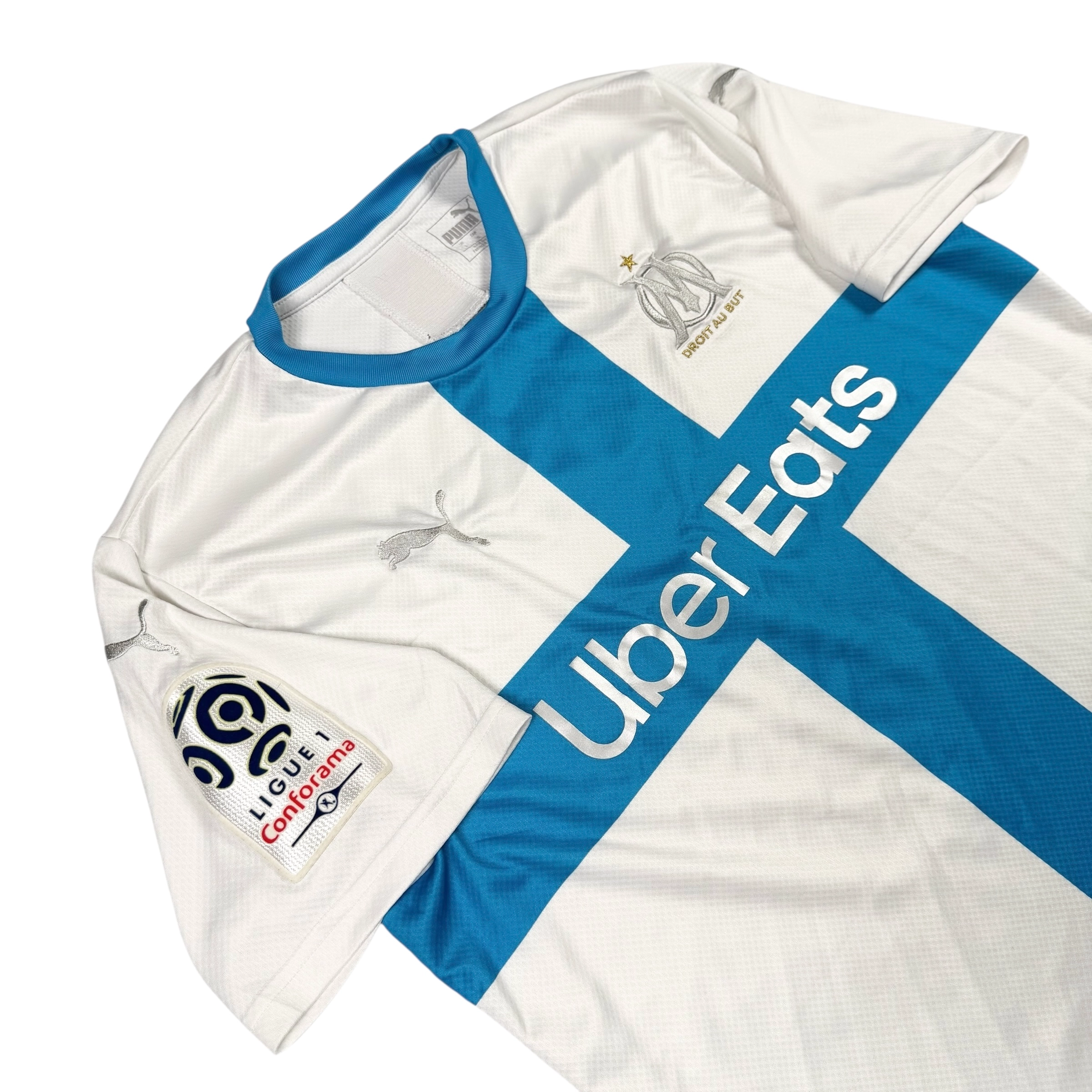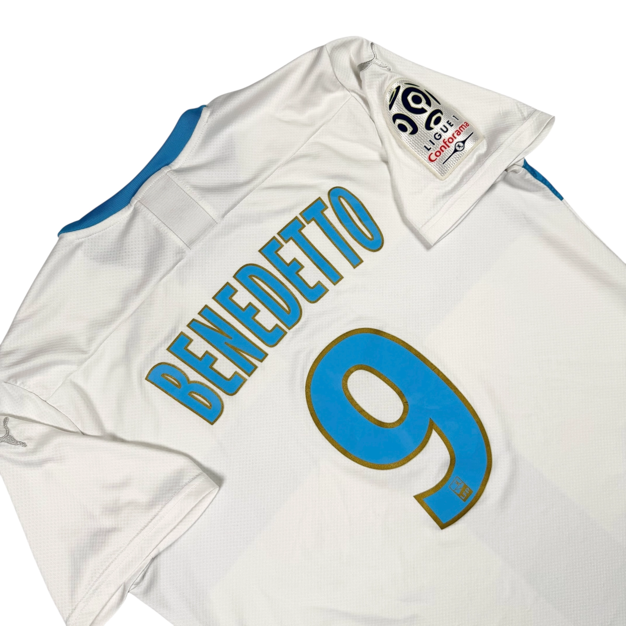 Note IFS : 9/10 – Maillot de l’Olympique de Marseille en excellent état, quatrième maillot avec le patch Ligue 1 et le flocage officiel de Darío Benedetto. Ensemble propre et bien conservé, une configuration complète et soignée, idéale pour les fans de l’OM et les amateurs de flocages officiels.
