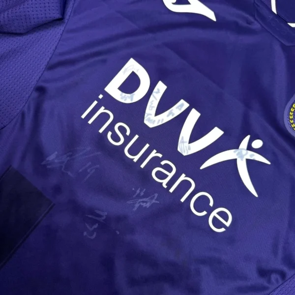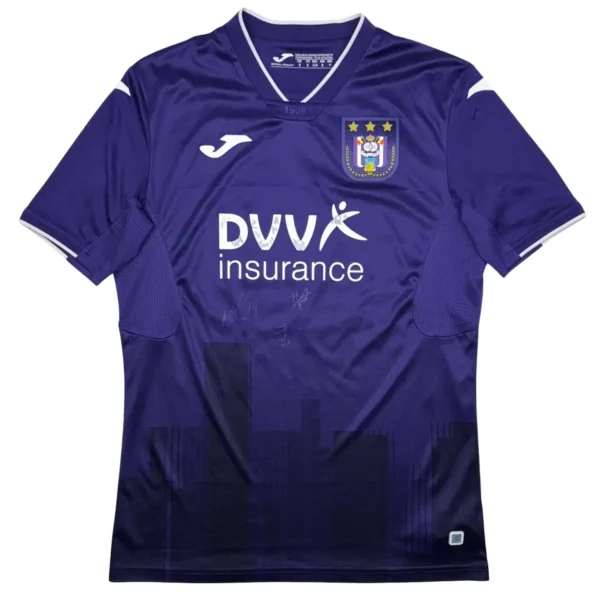Note IFS : 10/10 – Maillot du RSC Anderlecht 2020/21 en parfait état, floqué et signé. Signatures authentifiées de Bogdan Mykhaylichenko et Hendrik Van Crombrugge, capitaine et gardien emblématique du club. Une pièce collector des Mauves, idéale pour enrichir une collection dédiée au RSCA.