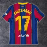 Note IFS : 9/10 – Maillot du Barça floqué Antoine Griezmann, signé Nike avec technologie Vaporknit : textile travaillé en relief, logo Nike et écusson thermocollés pour un rendu léger et premium.