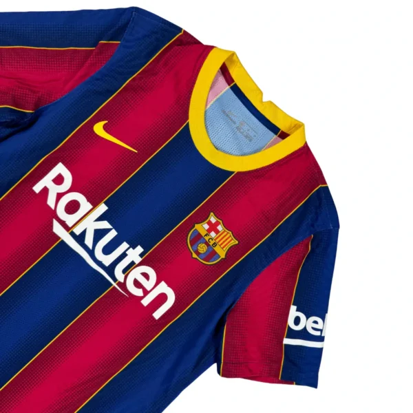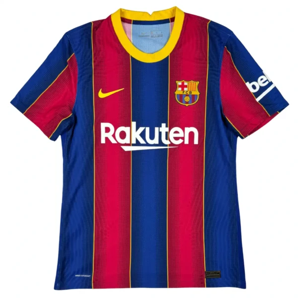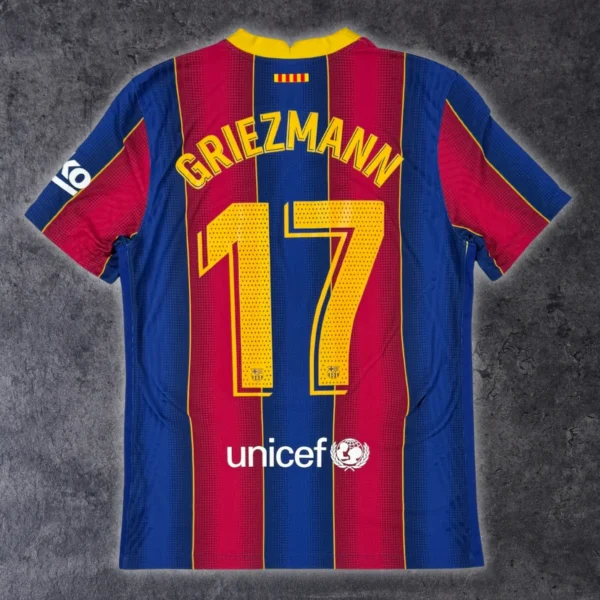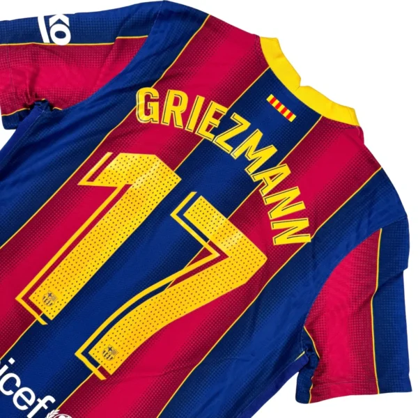 Note IFS : 9/10 – Maillot du Barça floqué Antoine Griezmann, signé Nike avec technologie Vaporknit : textile travaillé en relief, logo Nike et écusson thermocollés pour un rendu léger et premium.
