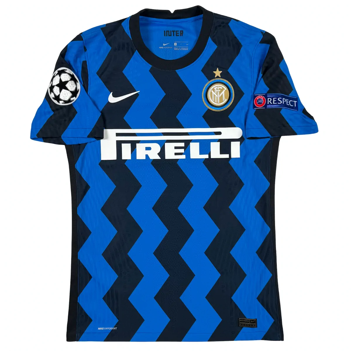Note IFS : 10/10 – Maillot domicile de l’Inter Milan en version pro Vaporknit, parfaitement conservé. Matière respirante et travaillée, logos thermocollés et patchs officiels Champions League. Dernier maillot à afficher le légendaire sponsor Pirelli, vendu 150 € à sa sortie. En bonus, floqué d’un joueur qui sort un peu de l’ordinaire. Une vraie pièce de caractère pour les fans des Nerazzurri.